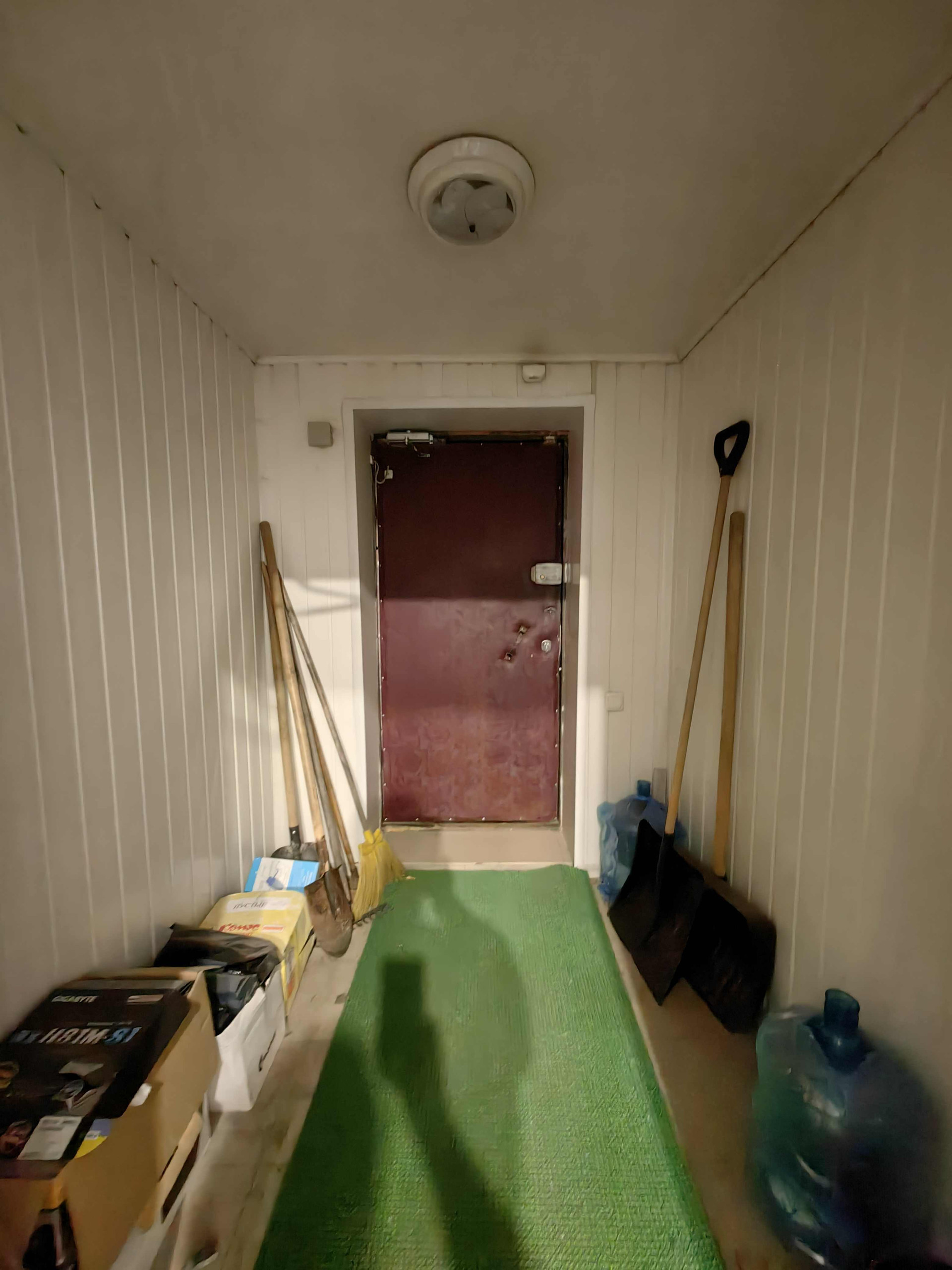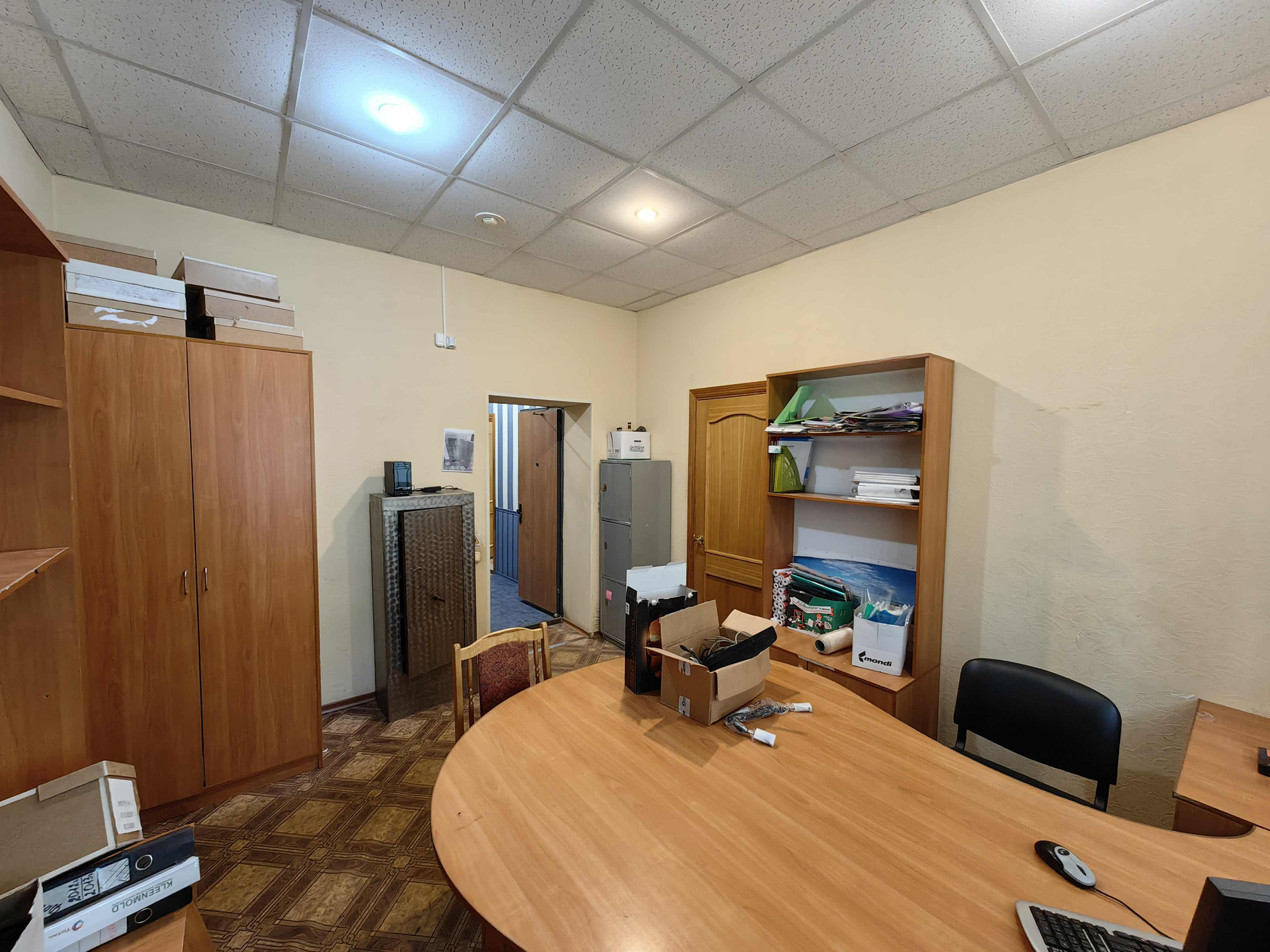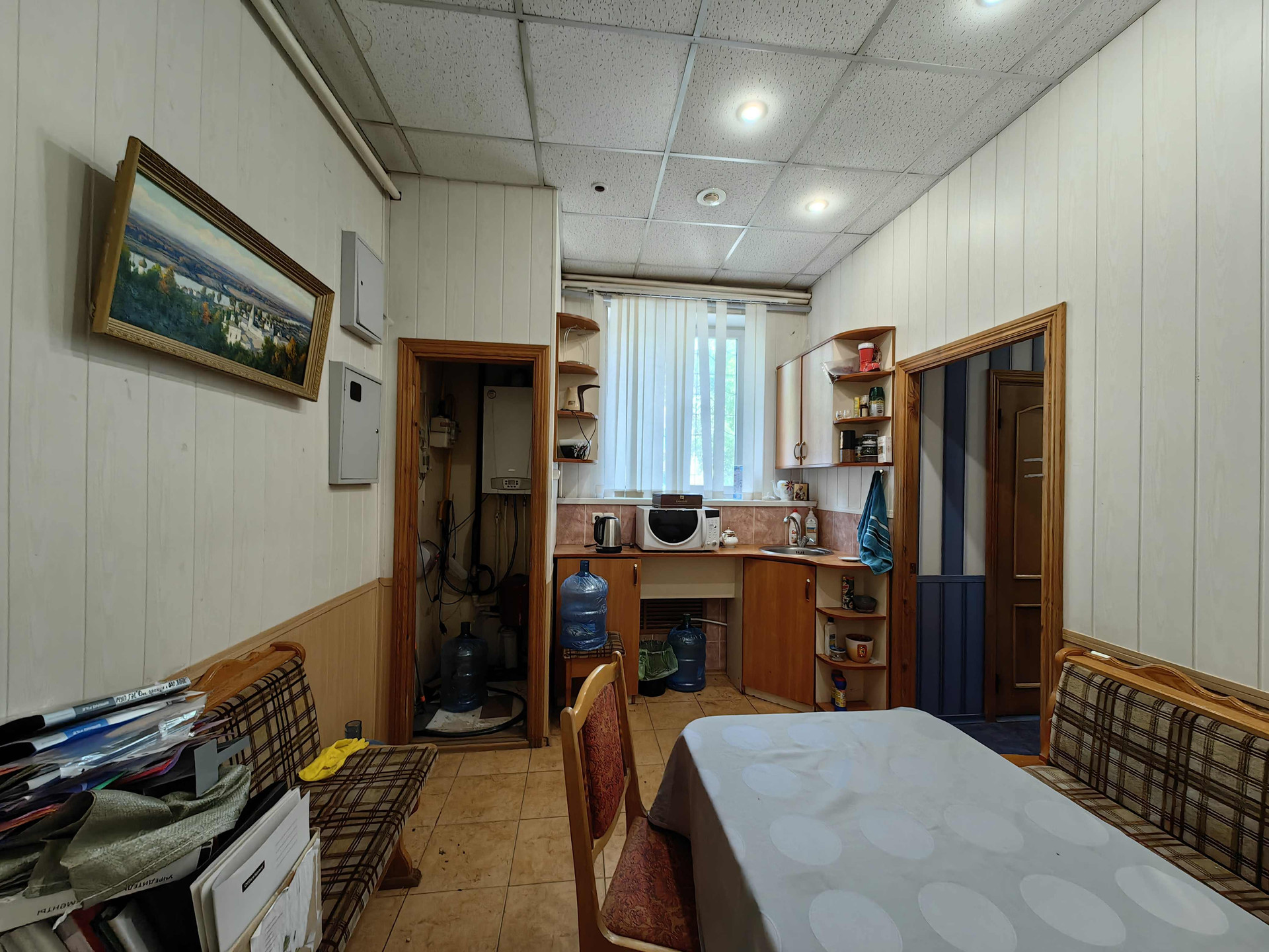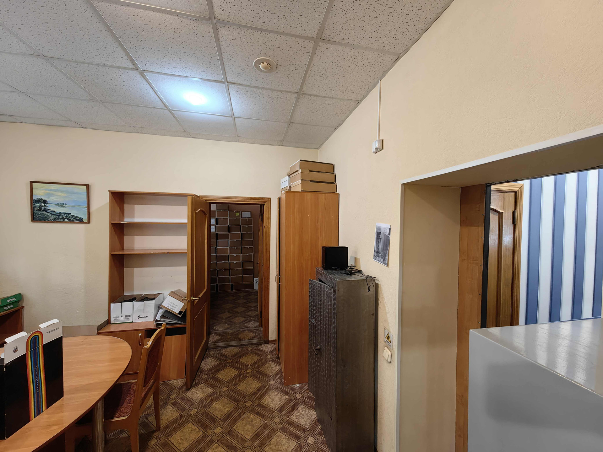Планировка: четыре помещения -комнаты, кухня с котельной, кладовое помещение (на фото с сейфами),  туалет, тамбур и коридор.