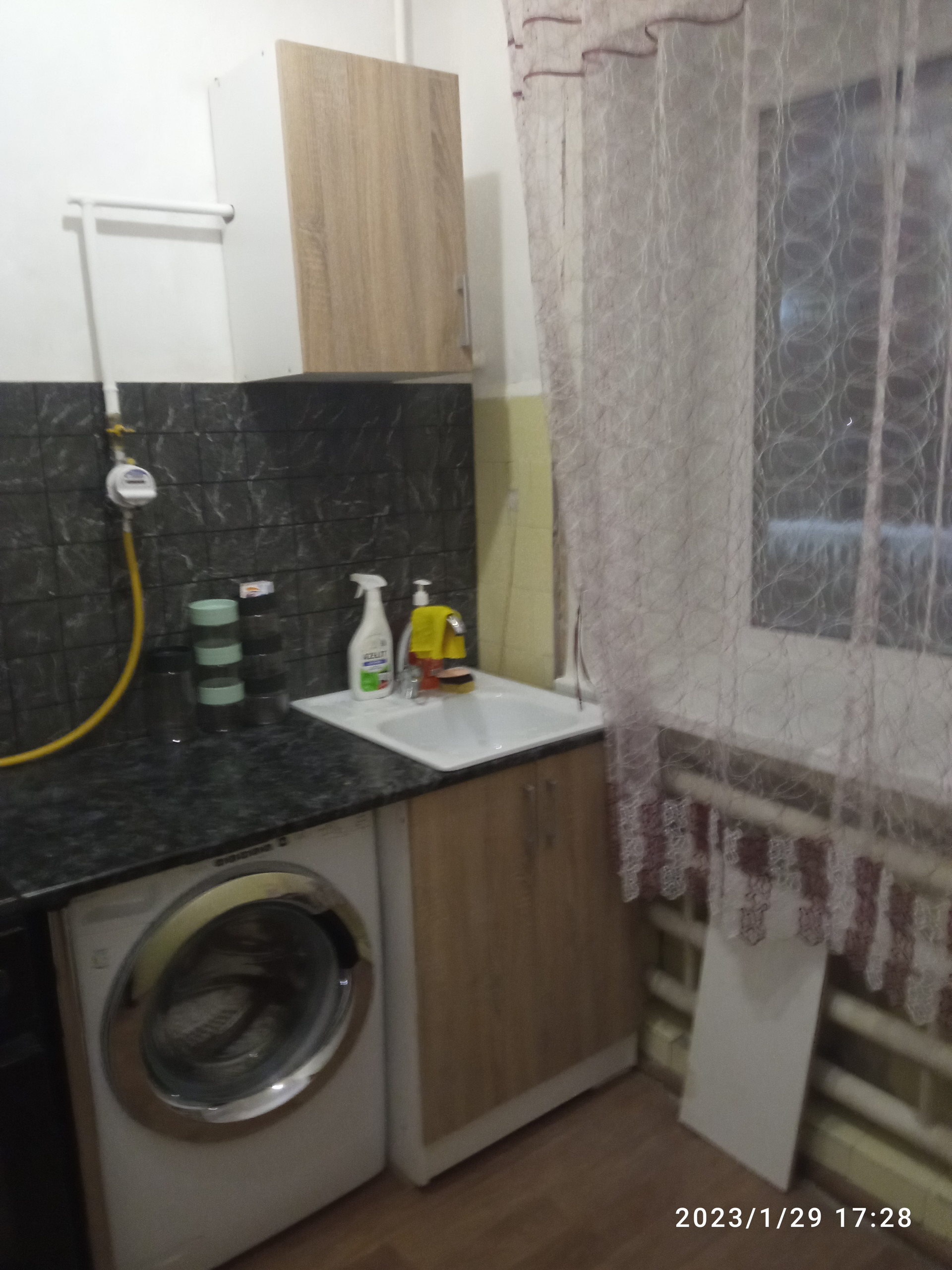 Имеются:плита газовая с рабочей духовкой, холодильник и стиральная машина, кое-что из посуды (если нужно).