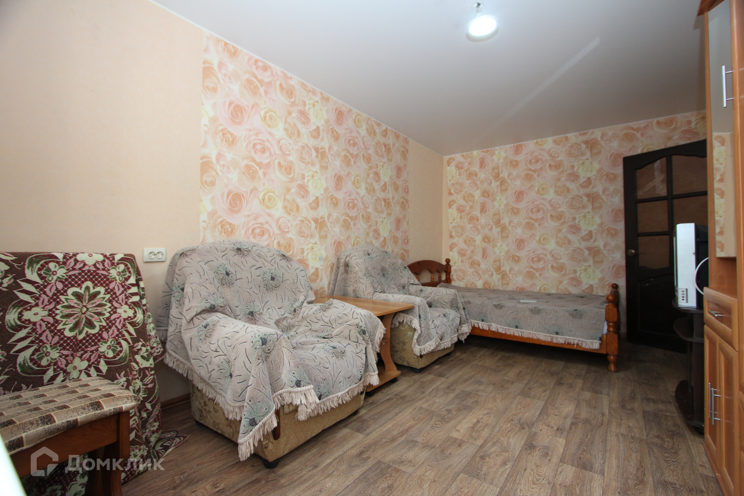 в комнате есть двухспальная кровать, 2 кресла и платяной шкаф, столик и тумба под ТВ