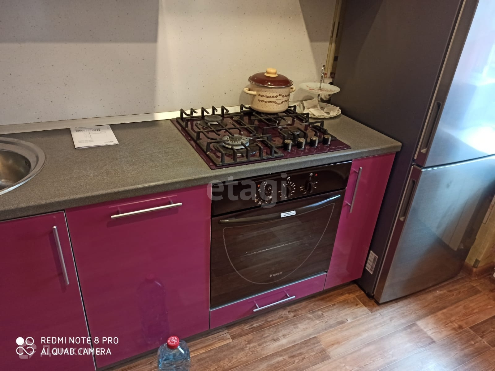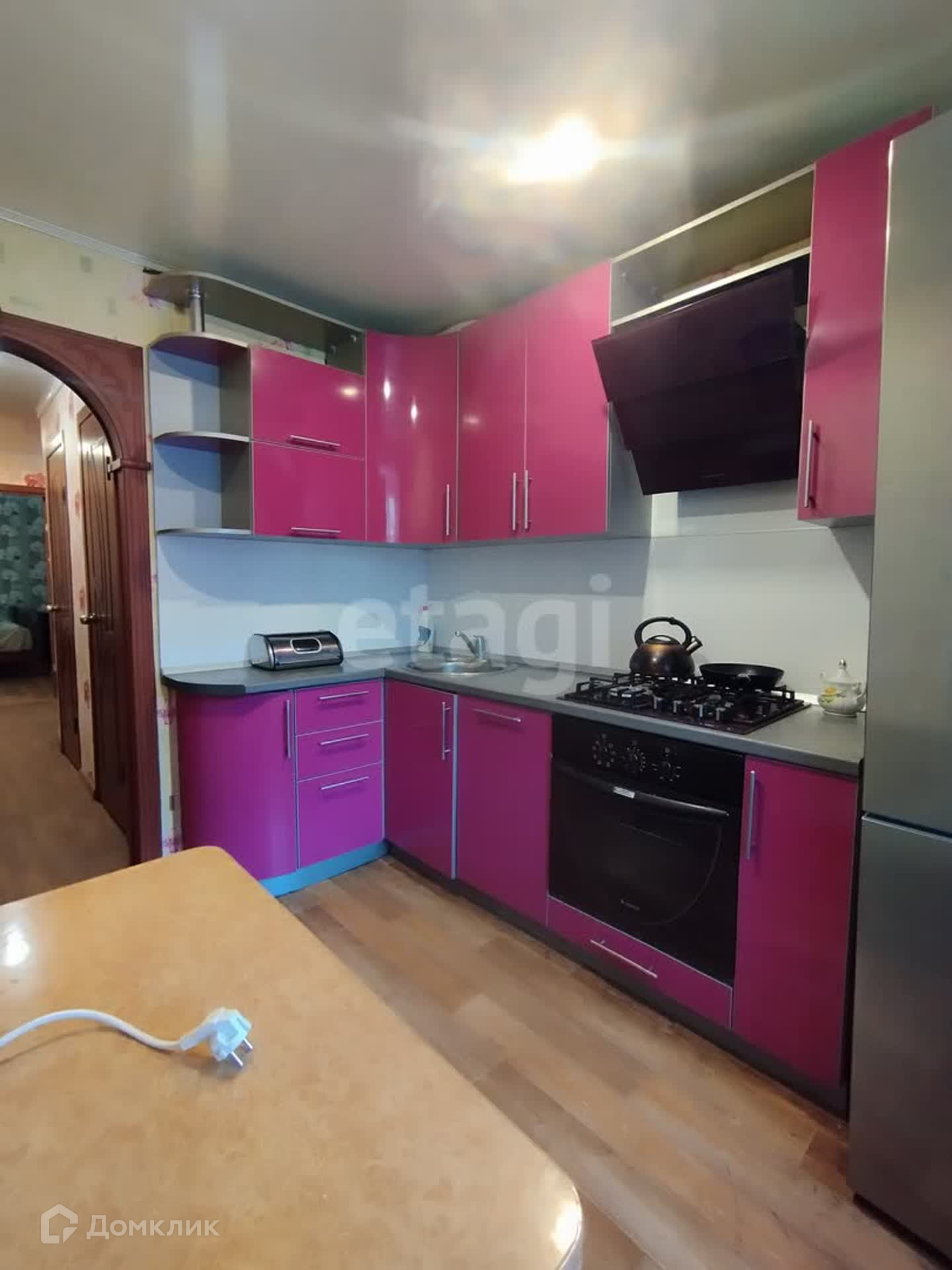 Из техники имеется посудомоечная машина, холодильник, стиральная машина, варочная панель, духовой шкаф, микроволновая печь, установлена вытяжка.
