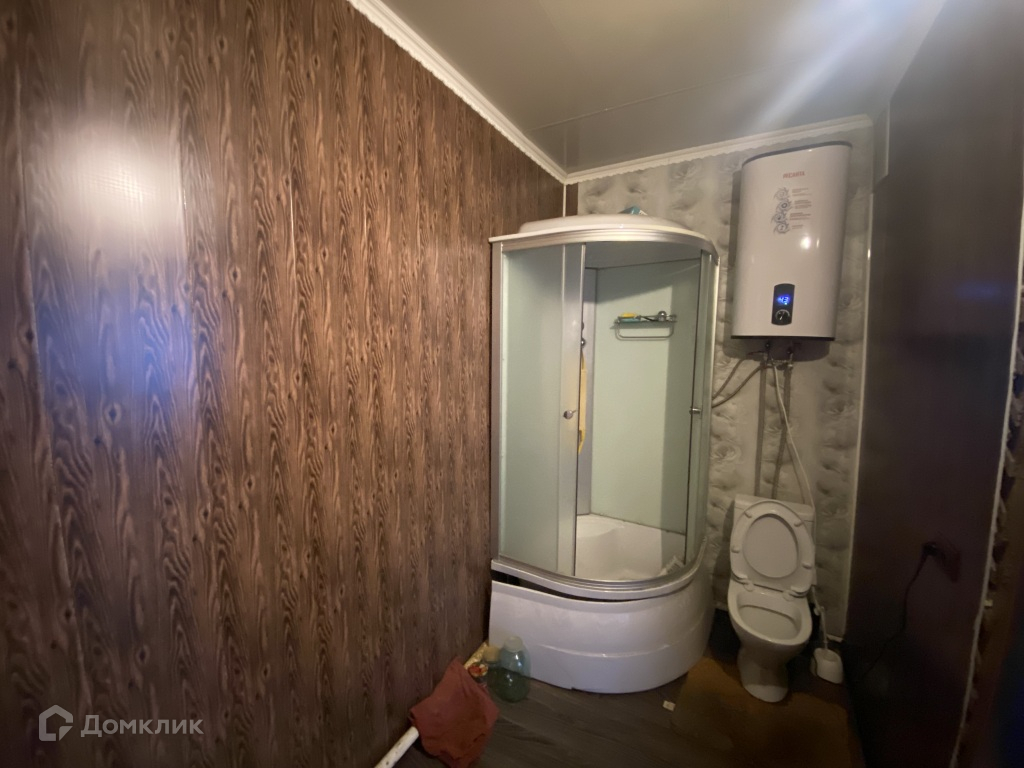 В душевой стены обшиты пластиковыми панелями, на полу постелен линолеум.