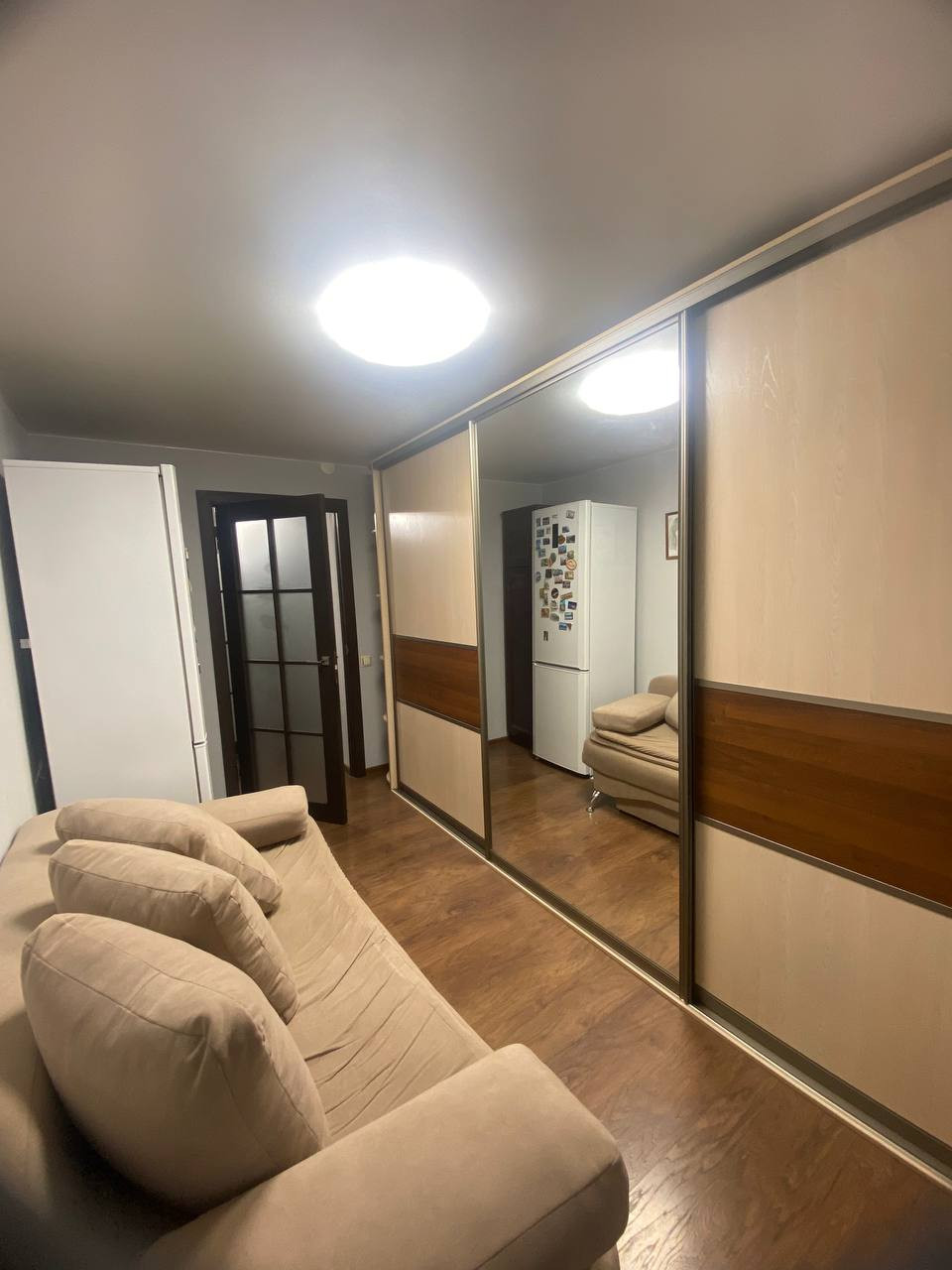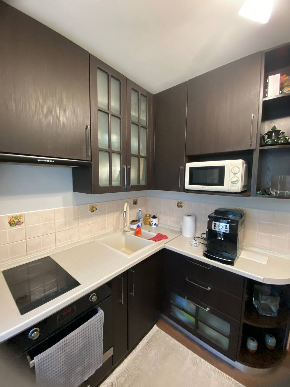 Новым хозяевам остаётся вместительная кухня со встроенной техникой и большой шкаф-купе в комнате.