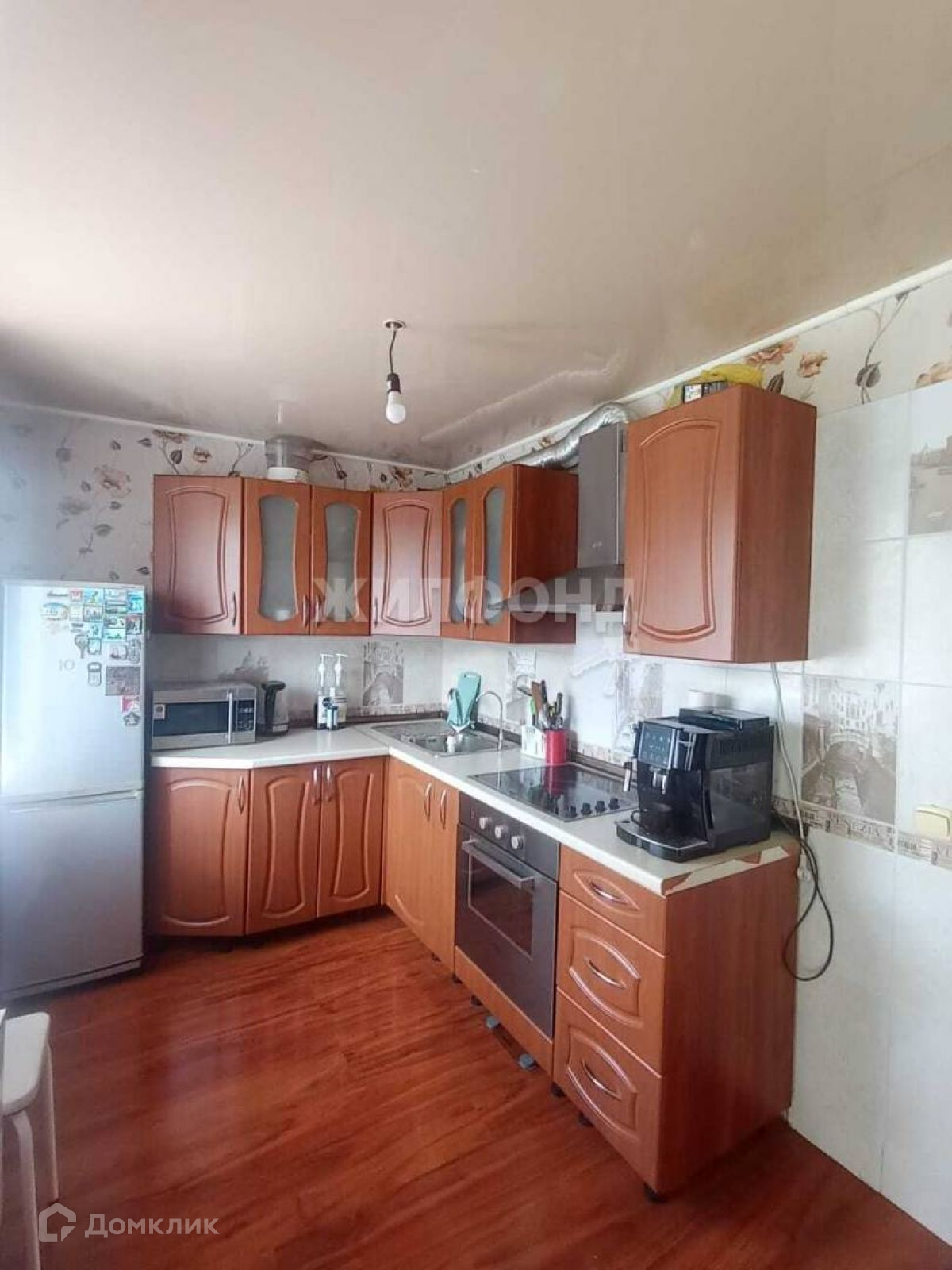 В спальне остаётся спальный гарнитур, а на кухне кухонный гарнитур со встроенной духовкой и варочной панелью.