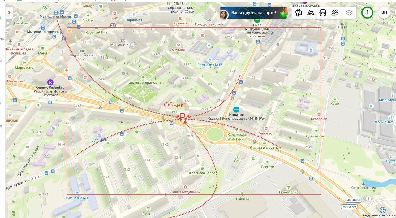 Рамкой указал зону 5 минут доступности.