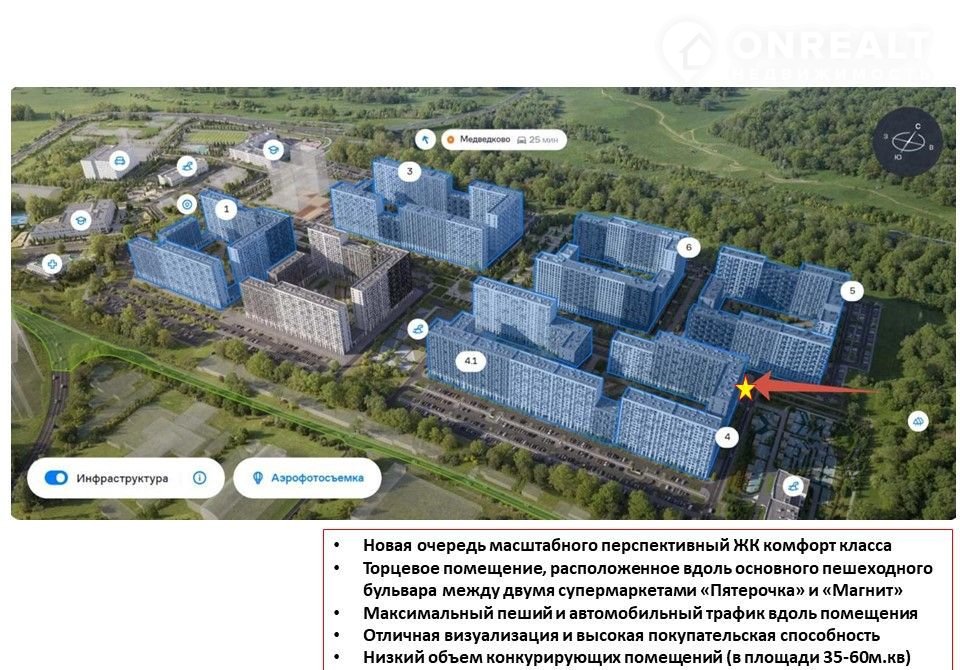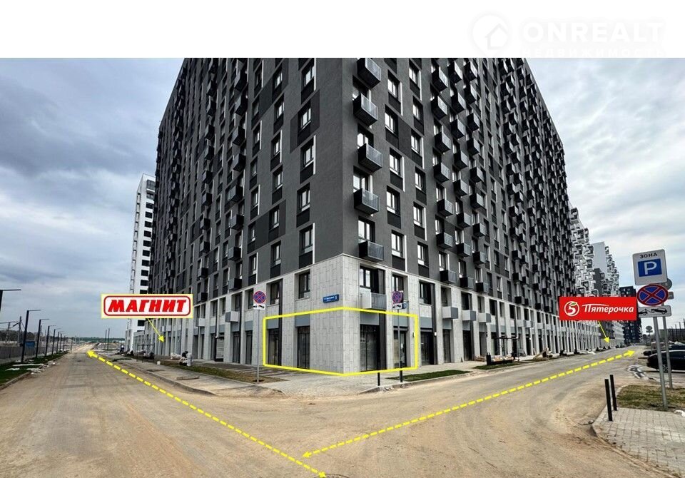Угловое помещение, окна на две стороны, максимальная визуализация с пешеходного и автомобильного трафика. Расположено напротив центральной аллеи, рядом строится детский садик, никаких ограничений по зоне разгрузке и парковки. Помещение окружено 2мя сетевыми супермаркетами: "Магнитом" и "Пятерочкой", что будет давать дополнительный положительный импульс.