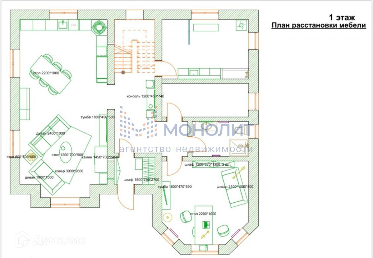 1 этаж - крыльцо-терраса, прихожая гардеробная, холл, кухня-гостиная с выходом на террасу, кабинет, гостевой санузел с душем, постирочная-гладильная, котельная