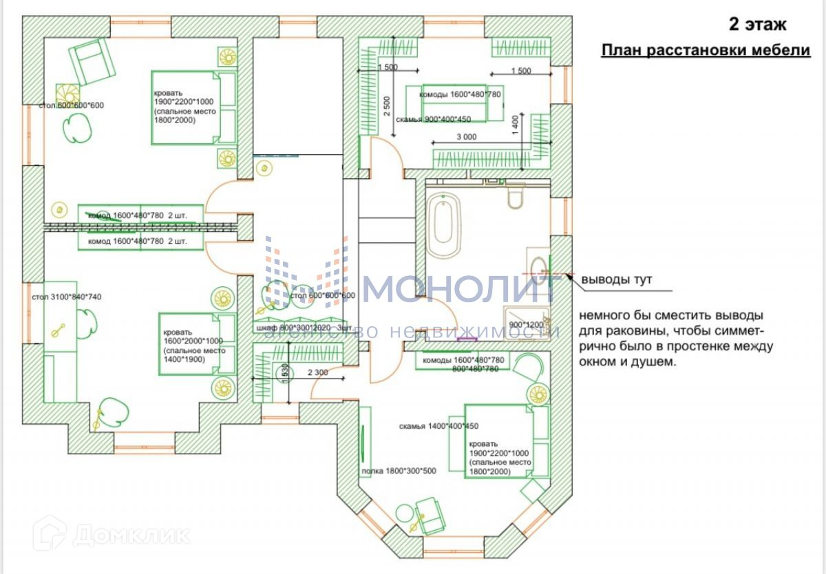 2 этаж - хозяйская спальня с гардеробной, санузел (душевая кабина и ванна), 2 спальни, комната-гардеробная