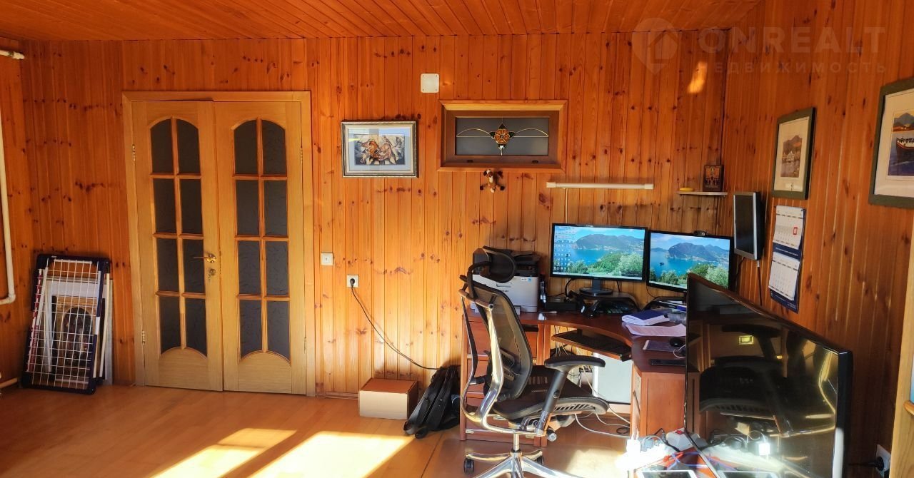 Гардеробная+встроенные шкафы и прочая мебель по всему дому. 3 кровати, диван. Письменные и компьютерные столы. Можно заехать сразу. Полностью обставленная сауна.