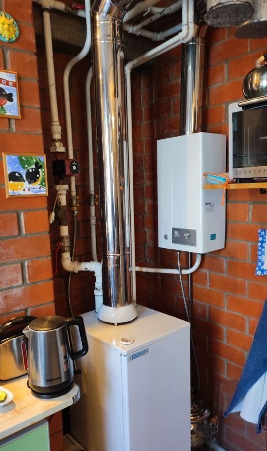Газовый котел, колонка. В гараже дровяная печь-камин Thorma.