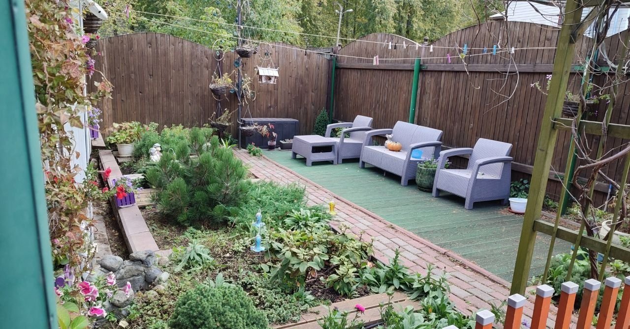 Зона отдыха перед домом, цветники, огородик на 3 грядки, двор на 2 авто, смородина, 2 черешни, хвойные, туи.