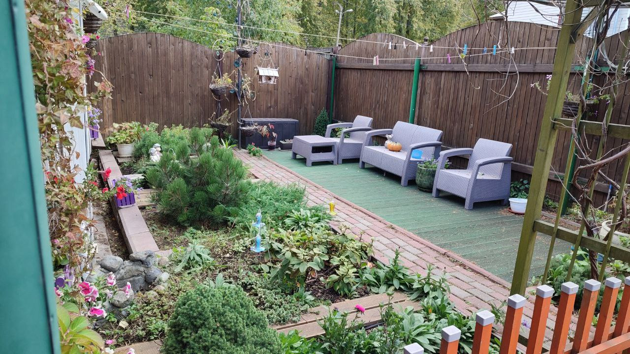 Зона отдыха перед домом, цветники, огородик на 3 грядки, двор на 2 авто, смородина, 2 черешни, хвойные, туи.