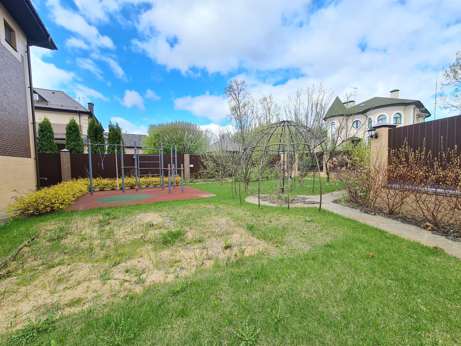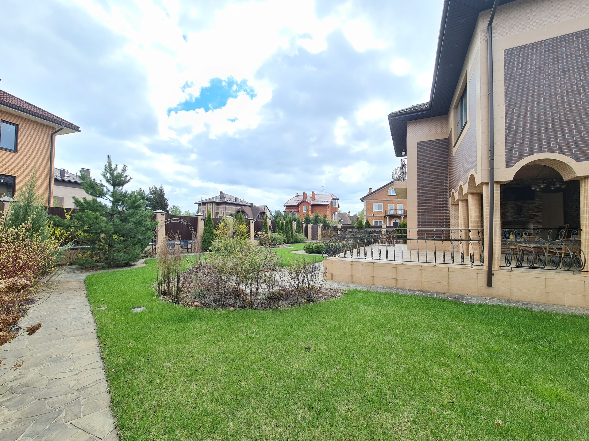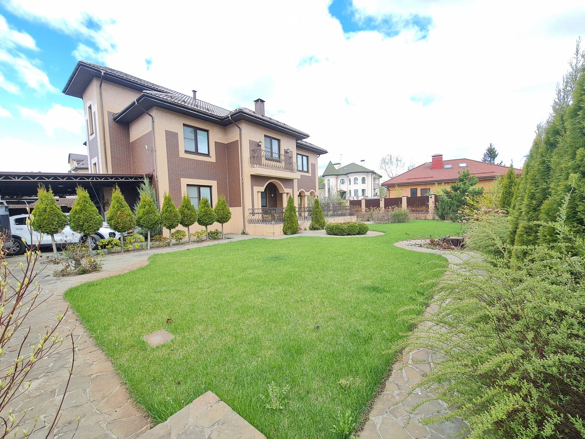 Ухоженный участок с ландшафтным дизайном: газон, дорожки, спортивная площадка, навес для автомобилей, плодовые деревья, кустарники.