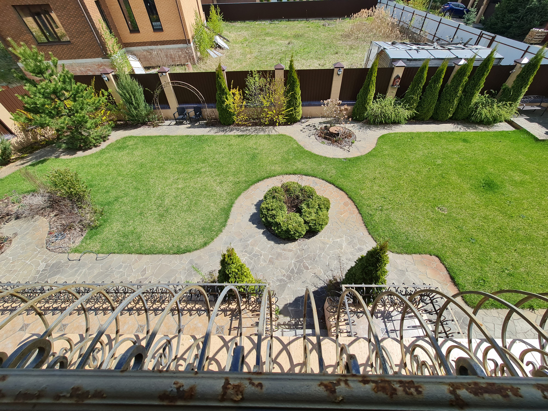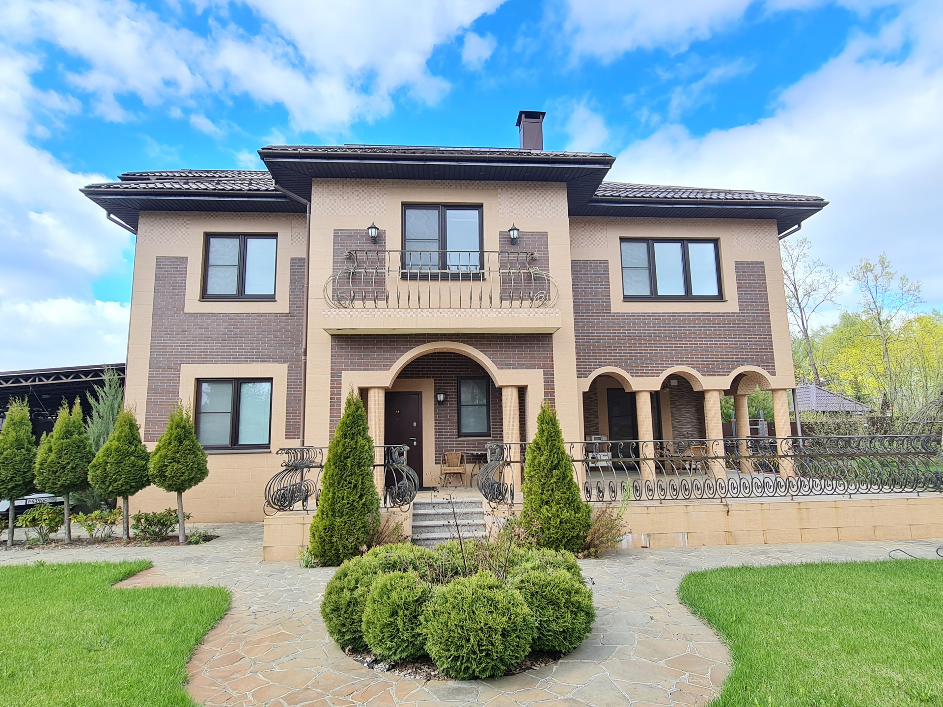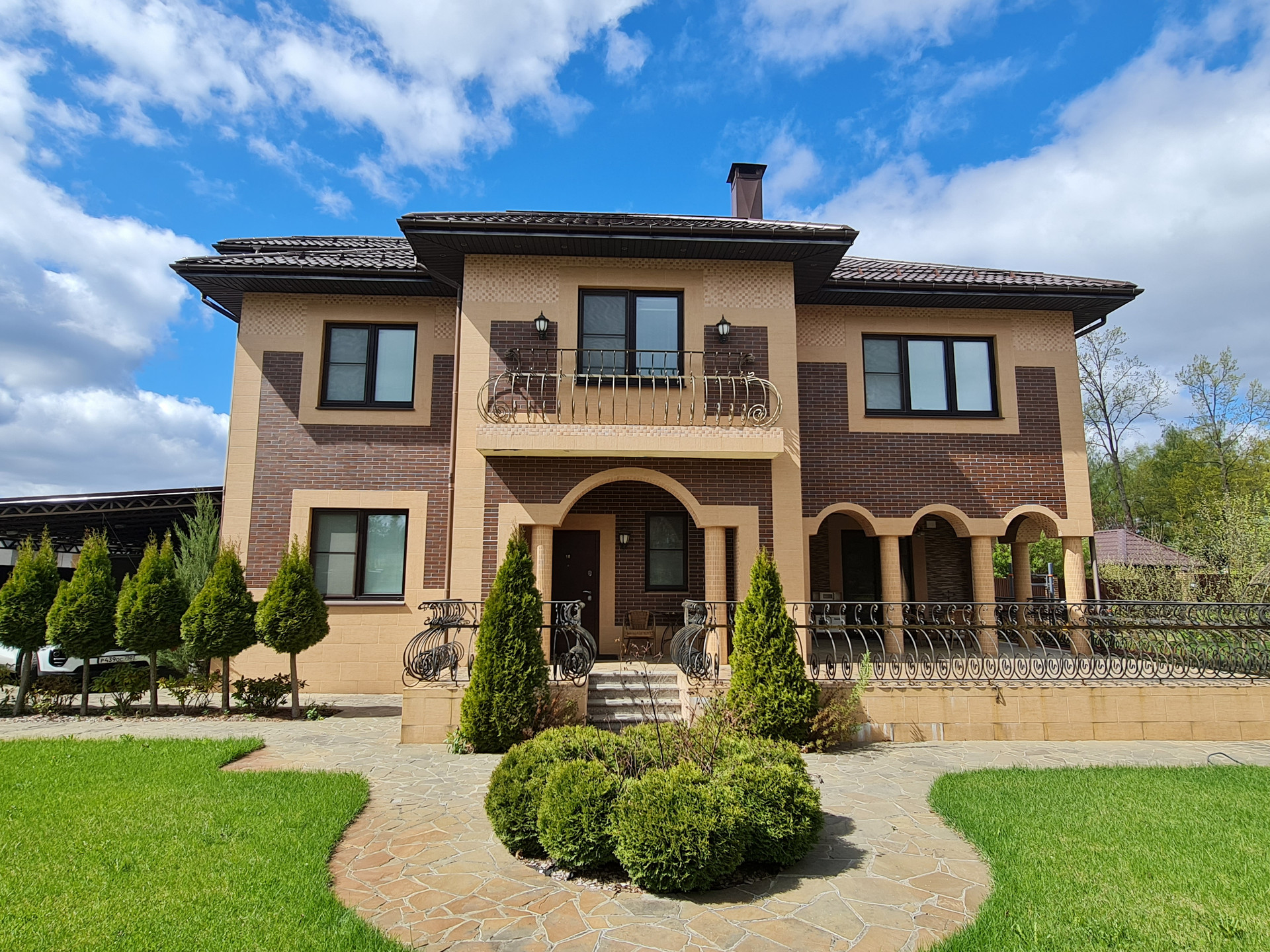 Ухоженный участок с ландшафтным дизайном: газон, дорожки, спортивная площадка, навес для автомобилей, плодовые деревья, кустарники.