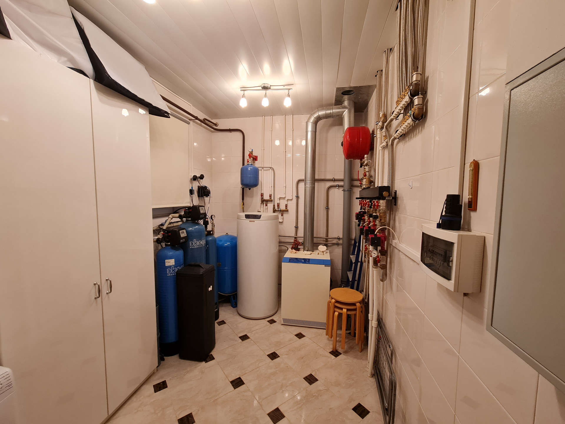 В доме на первом этаже: прихожая с гардеробной комнатой, кабинет, гостиная, кухня-столовая с выходом на террасу, санузел, котельная. На втором этаже четыре комнаты, холл, два санузла, гардеробная комната. Мансарда: большая комната, сауна, санузел, кладовая.