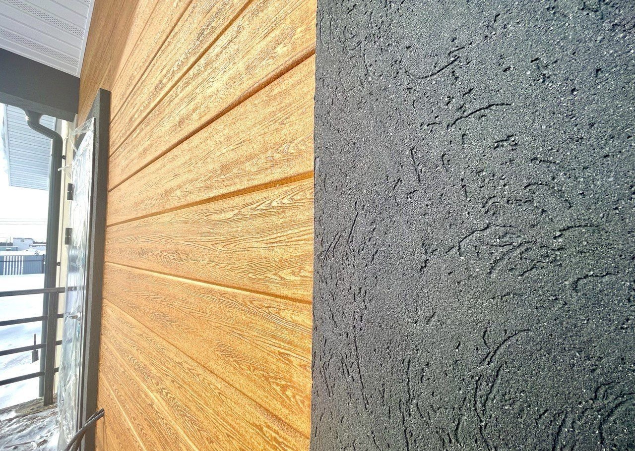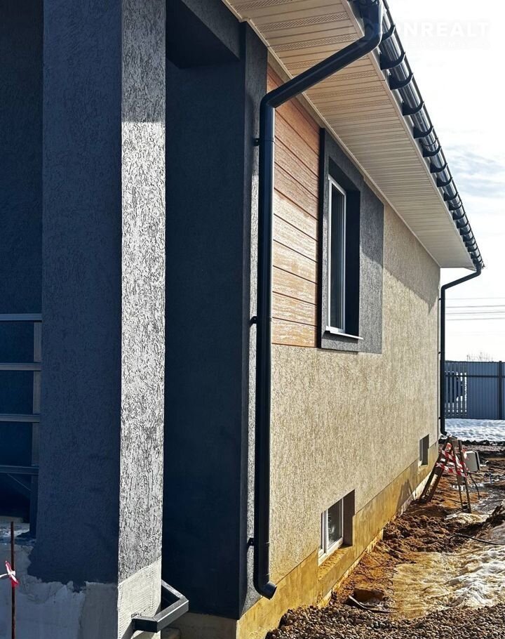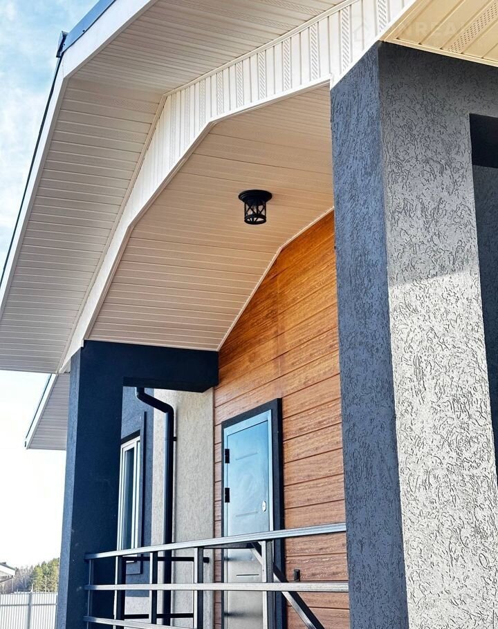 ✔️Цокольный этаж из фундаментных монолитных панелей. Входная дверь металлическая. Дом покрашен снаружи оштукатурен и покрашен, нанесены декоративные элементы.