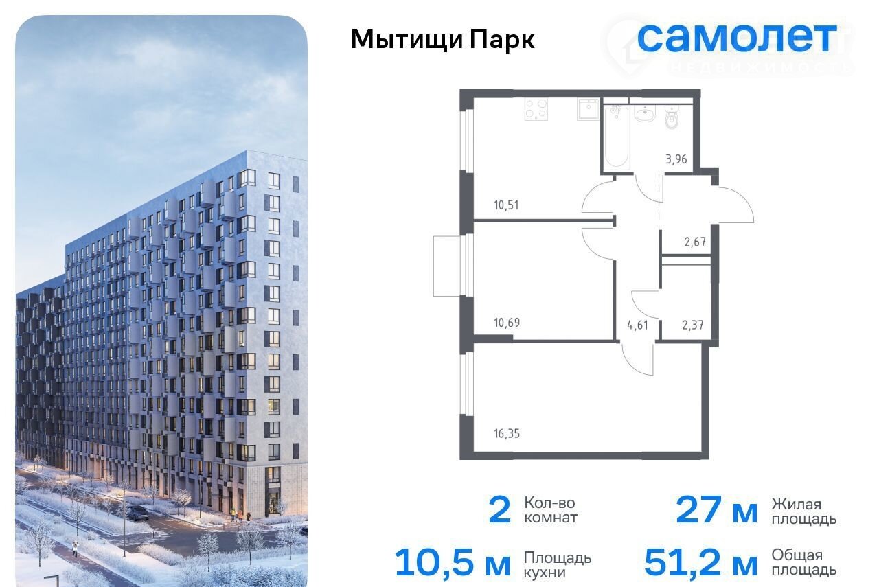 2-комнатная квартира, 51.2 м2, этаж 8 / 17, на продажу в Мытищах, жилой комплекс Мытищи Парк, к5