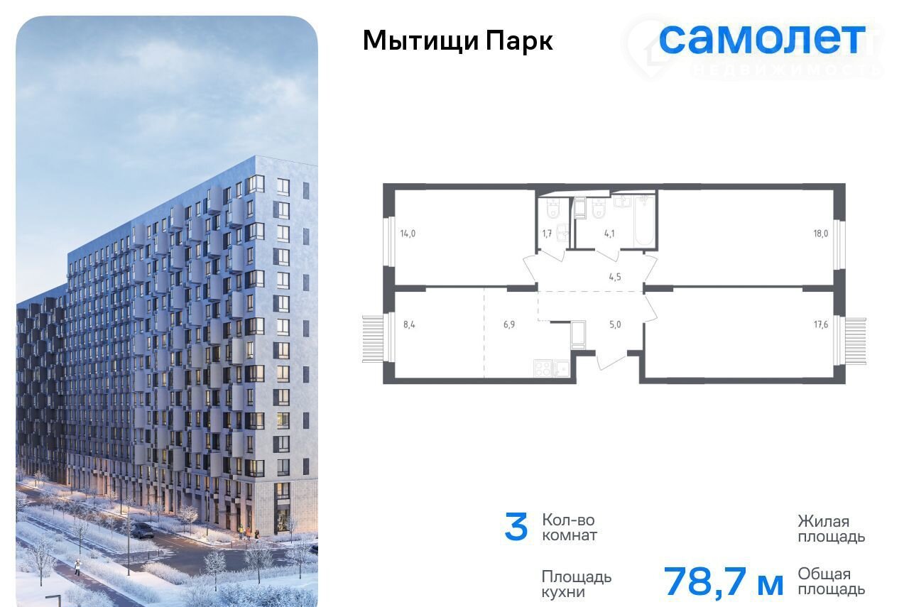 3-комнатная квартира, 78.7 м2, этаж 3 / 17, на продажу в Мытищах, 1-й Стрелковый переулок, 5