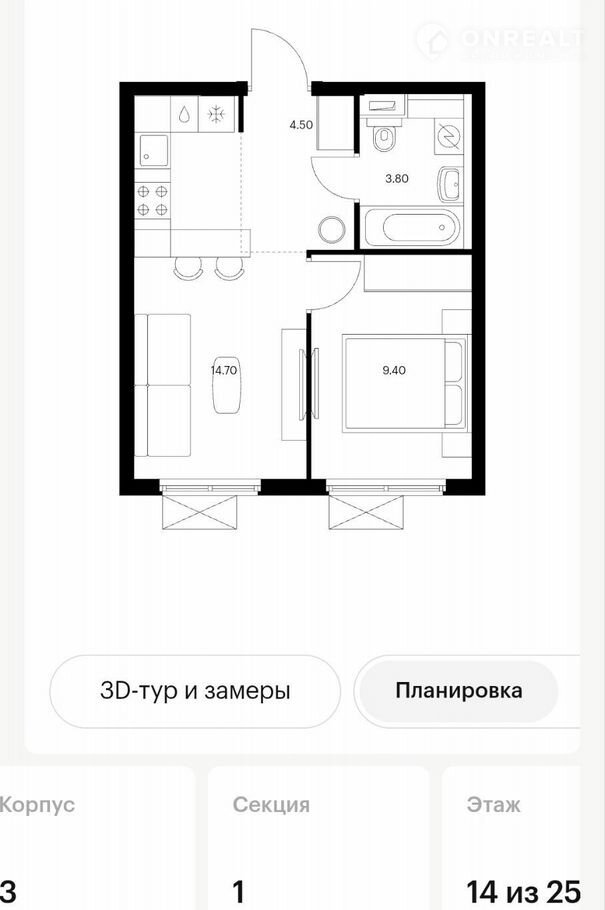 1-комнатная квартира, 32.4 м2, этаж 14 / 25, на продажу в Мытищах