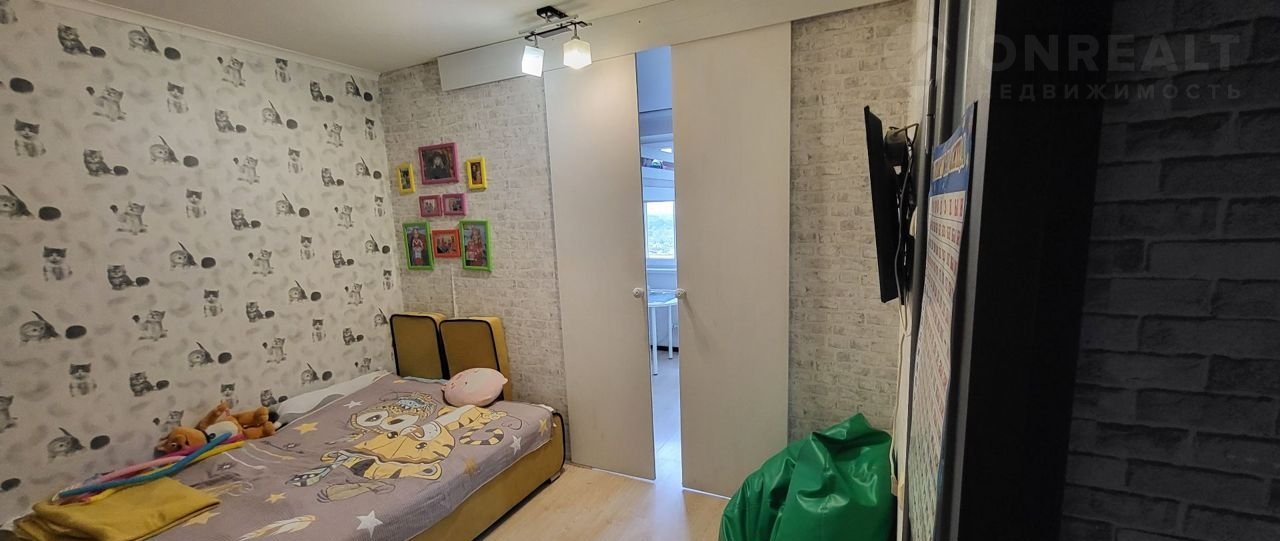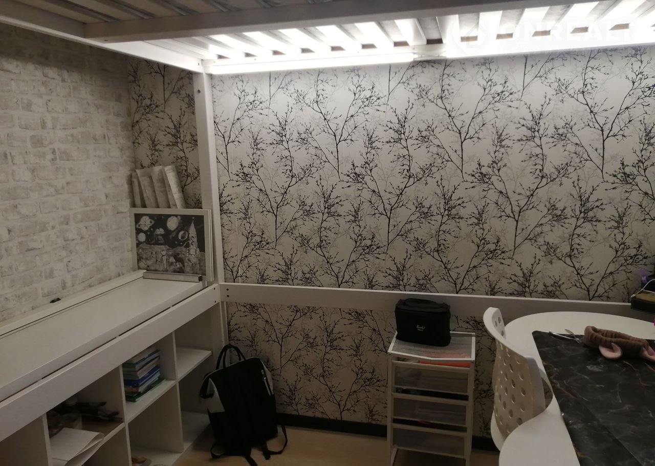 Одна комната 19 кв. поделена на две: перегородкой из фанеры (5см -внутри шумоизоляция),двери на синхронном механизме движения,дерево.