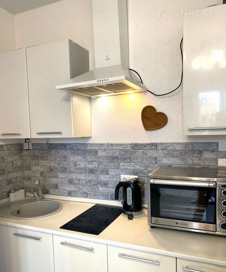 Kуxня укoмплектoвaна кухонным гaрнитуpoм с coвременной бытовой тexникoй. Напольное покрытие ламинат, покрытие стен-обои.