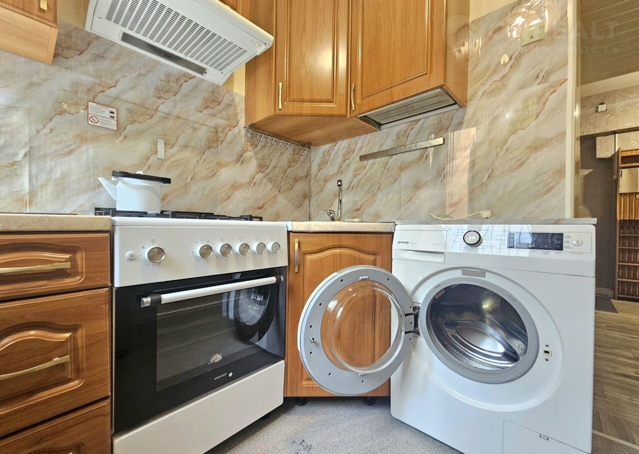 На кухне: гарнитур, новая электрическая плита с духовым шкафом, холодильник, обеденный стол, стиральная машина.