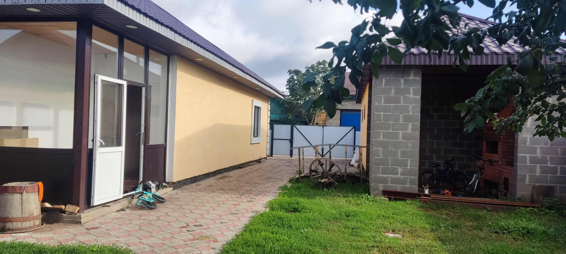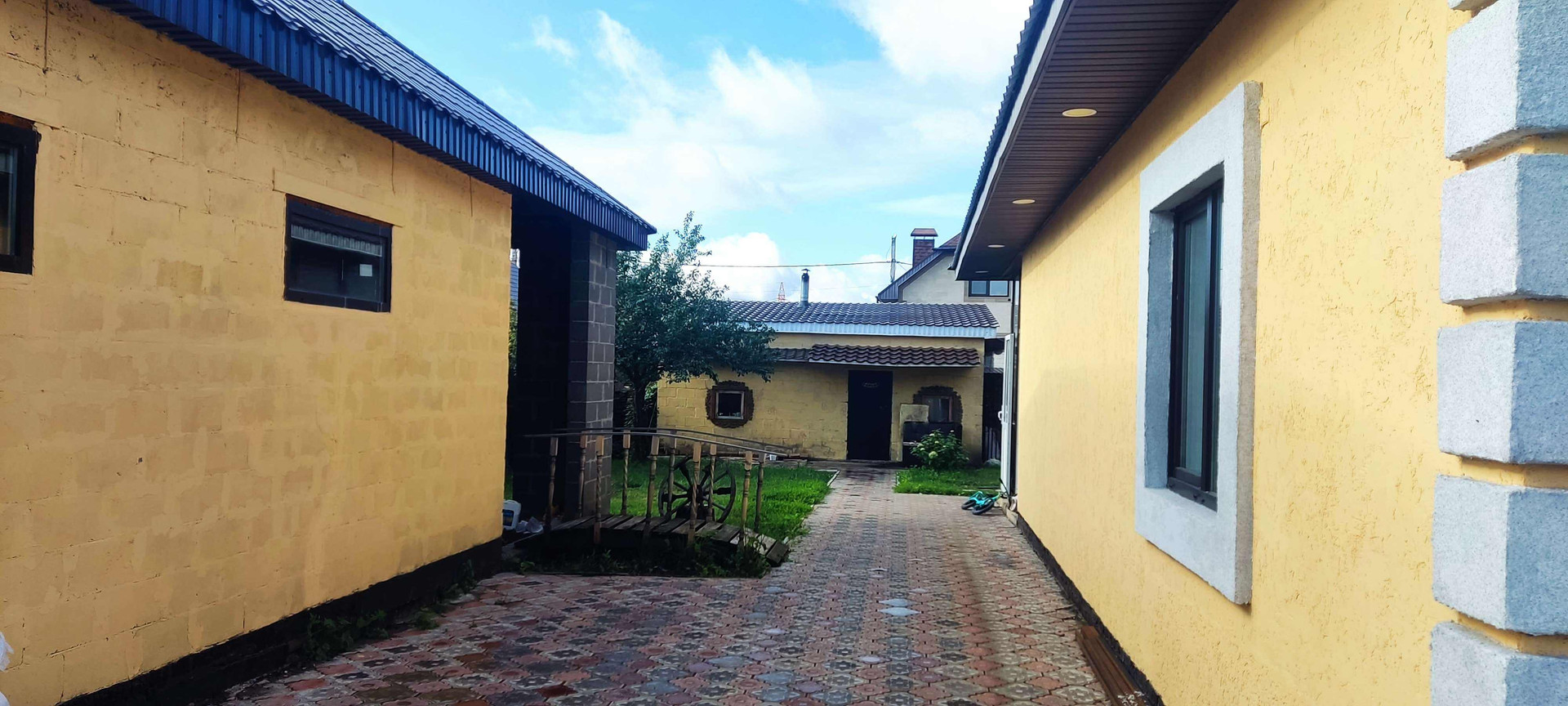 во дворе брусчатка, мангальная зона,