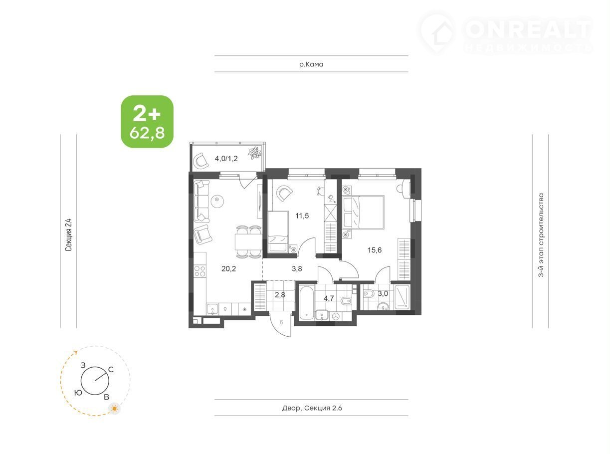 Общая площадь 62.8 м2