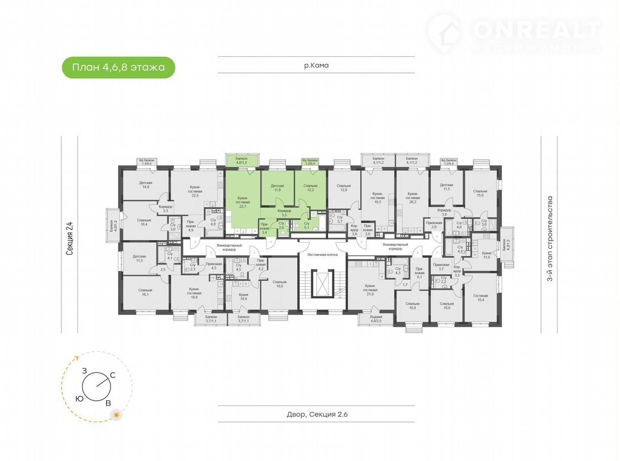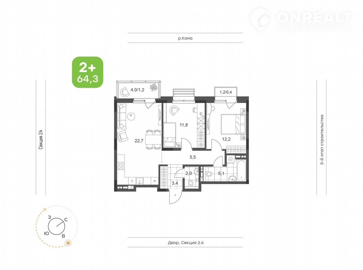 2-комнатная квартира, 64.3 м2, этаж 4 / 9, на продажу в Набережных Челнах