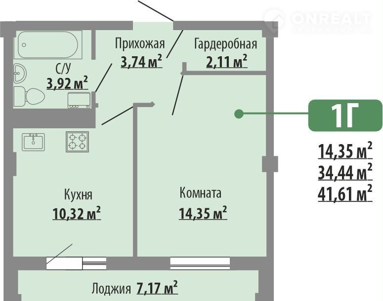 Общая площадь 41.6 м2