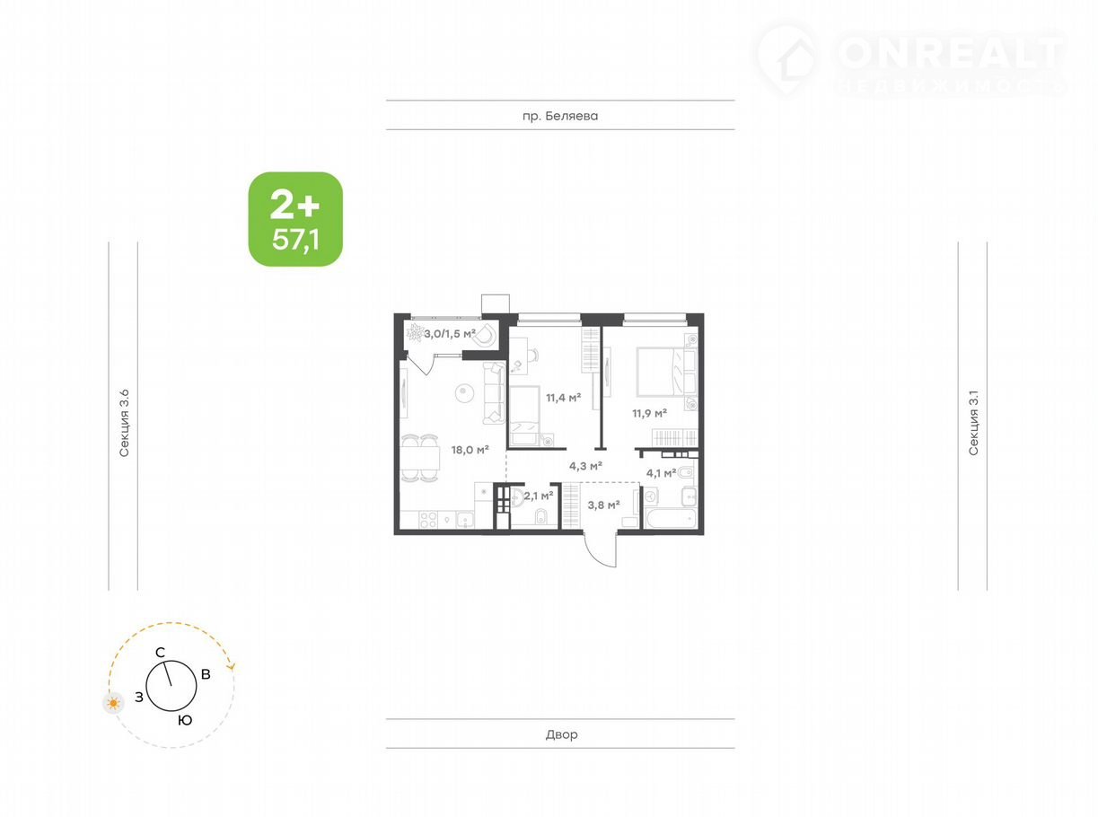 Общая площадь 57.1 м2