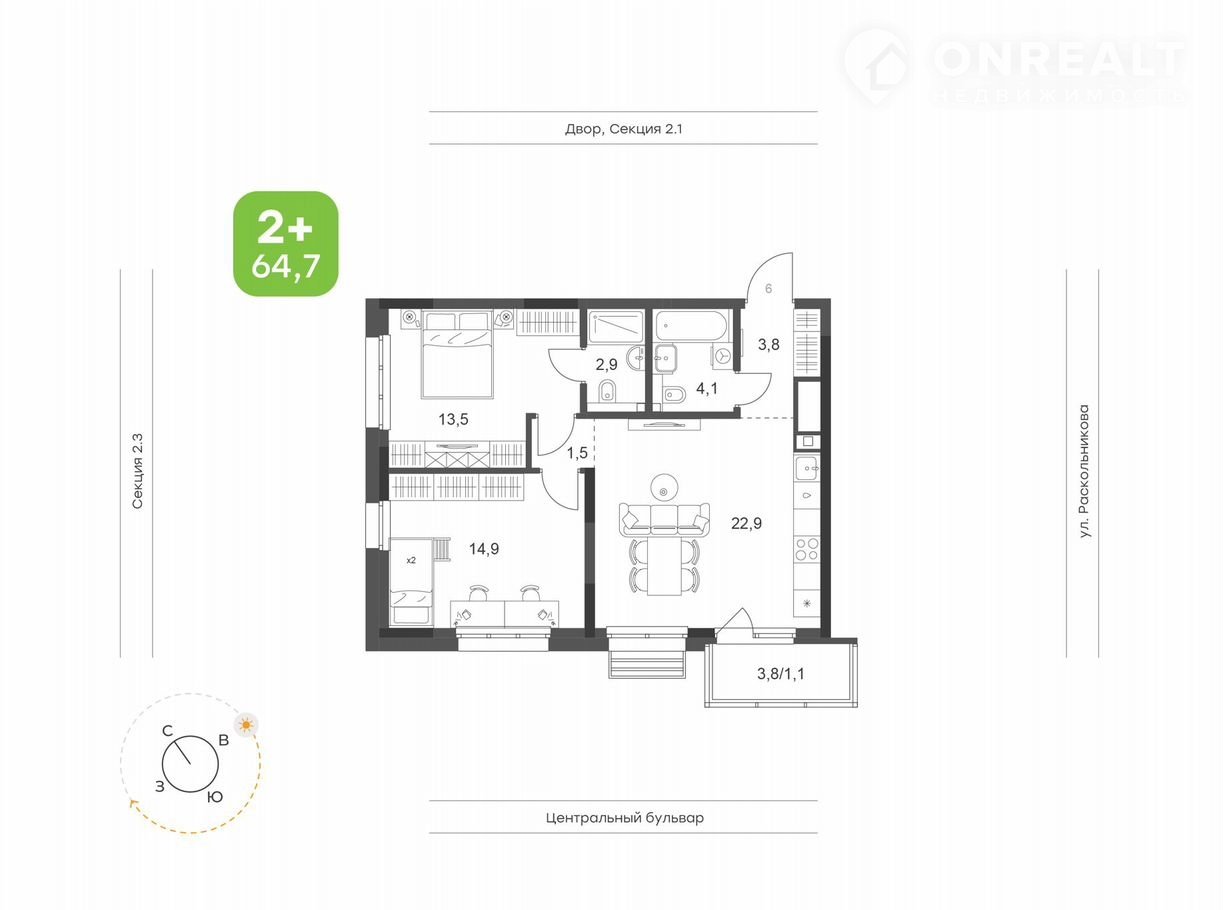 Общая площадь 64.7 м2