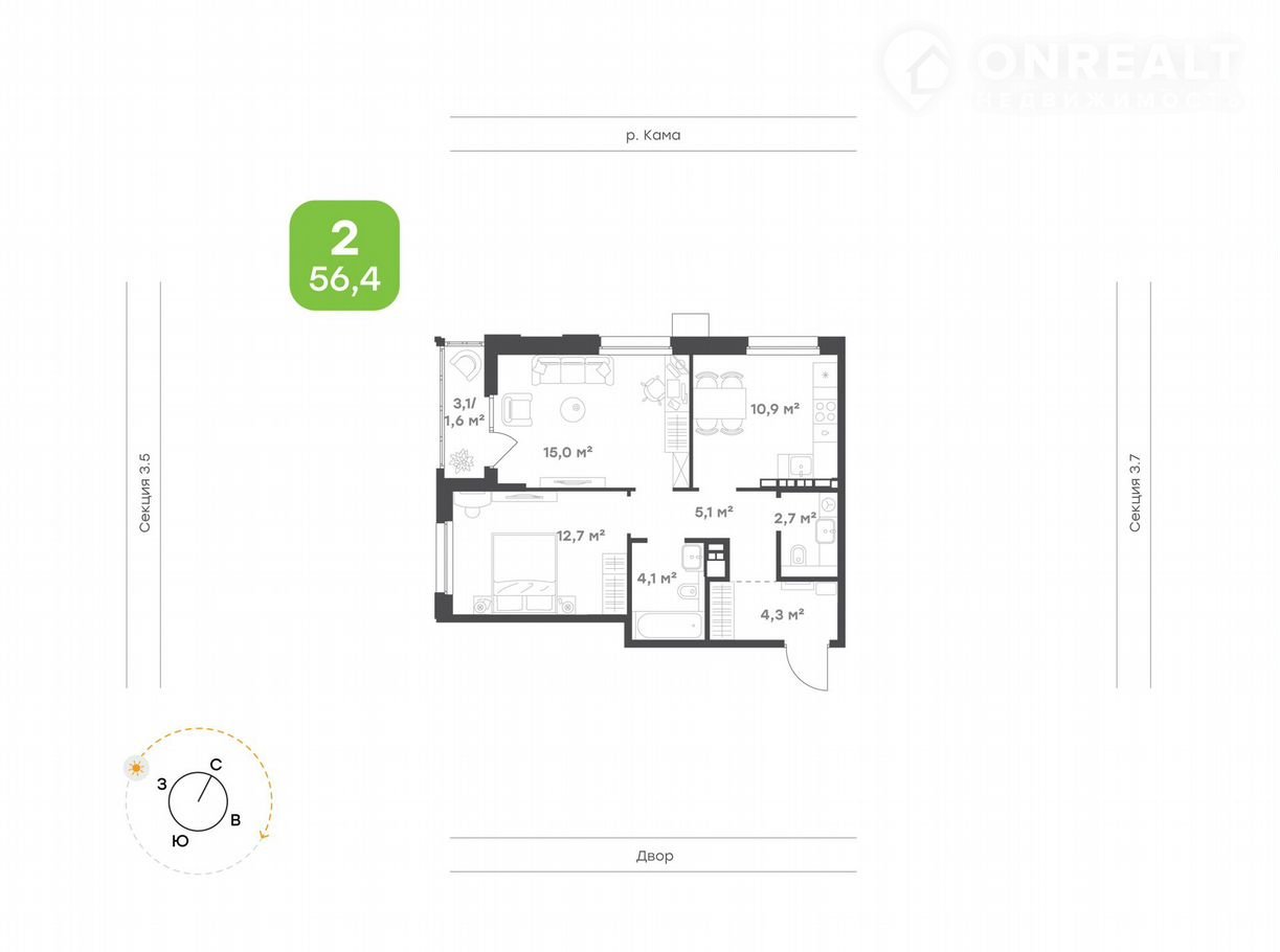 2-комнатная квартира, 57.9 м2, этаж 5 / 9, на продажу в Набережных Челнах