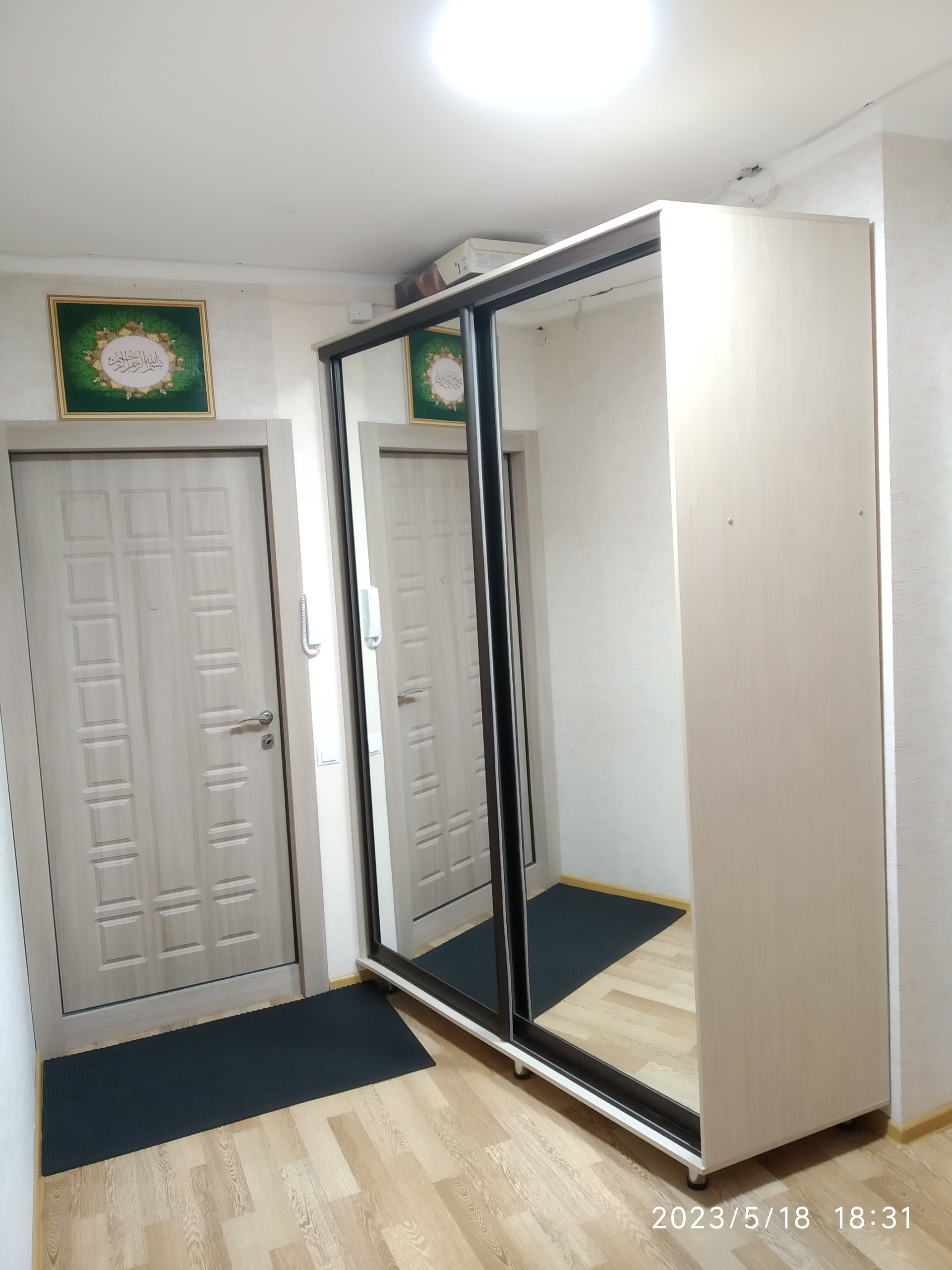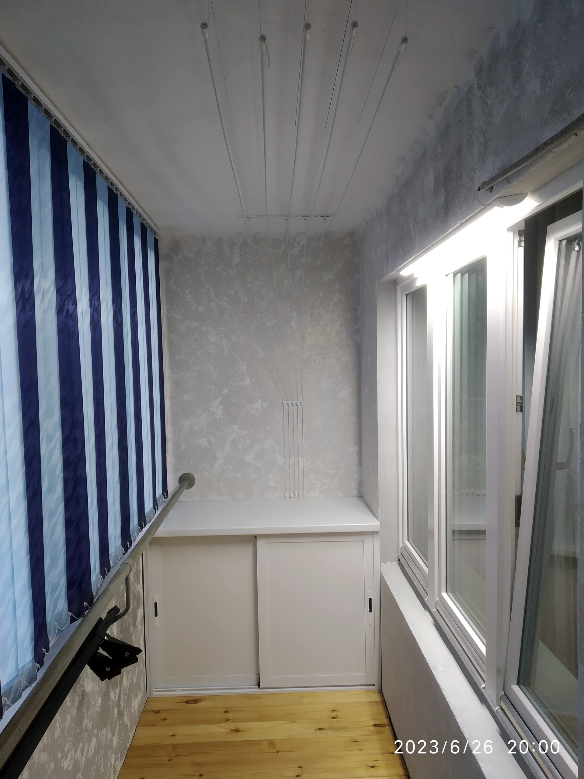 -На балконе деревянный пол утеплён мин.ватой 150мм. Стены отделаны декоративной штукатуркой.С двух сторон вместительные шкафы купе,жалюзи на окнах.