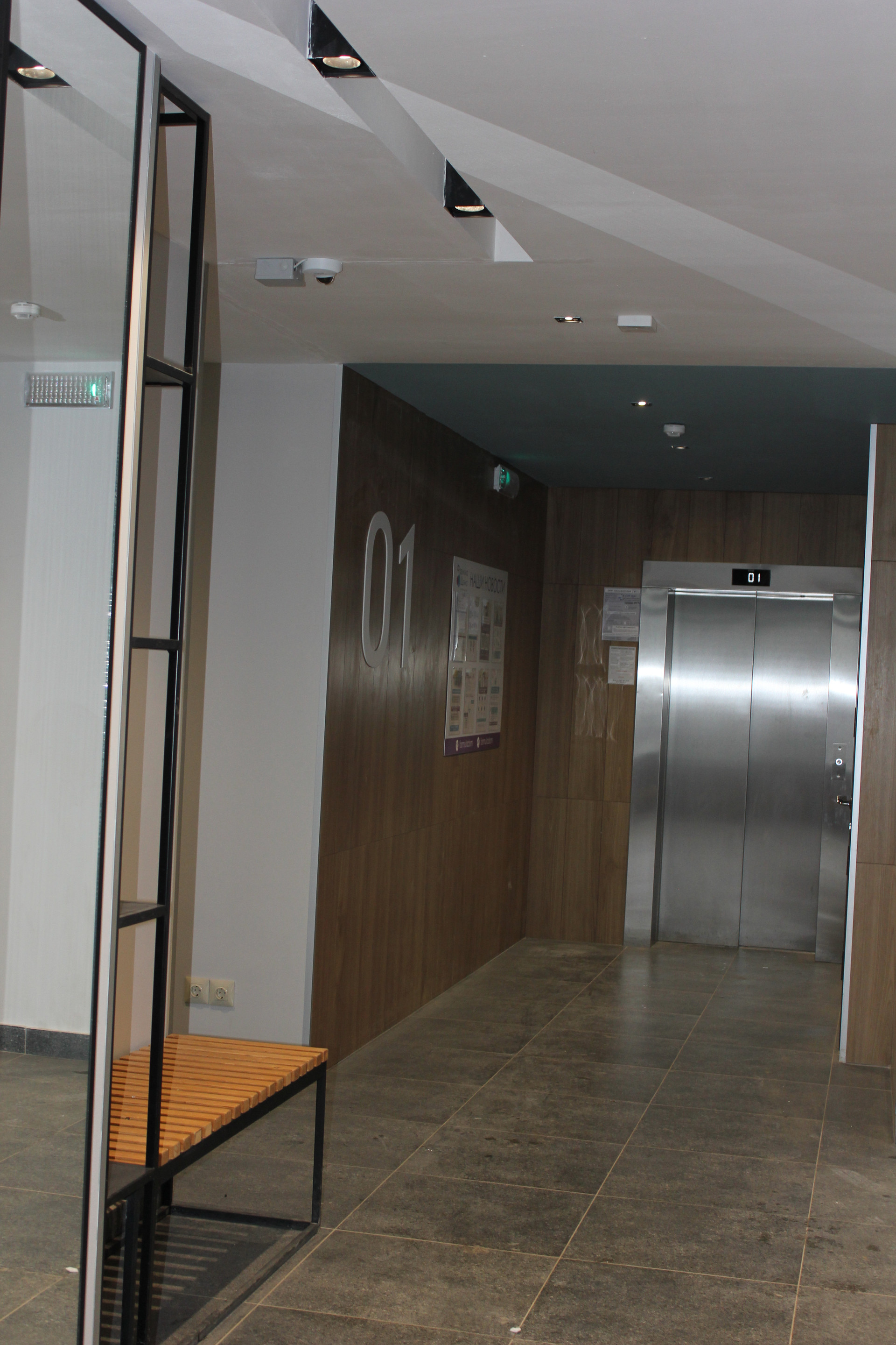 Подъезд в современной отделке,  в кафеле, лифты "Оттис".