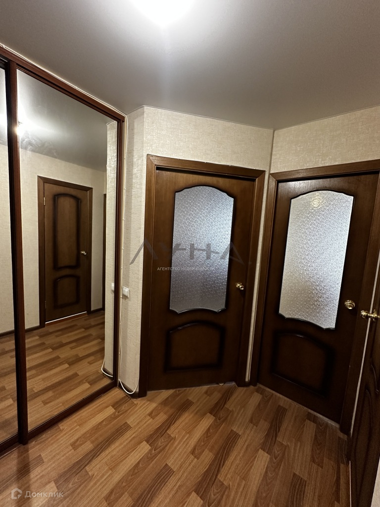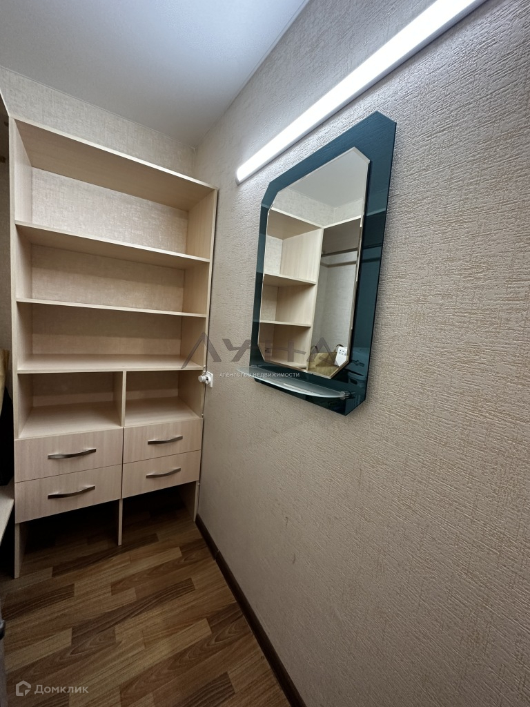 Огромное преимущество-гардеробная комната, скрытая за зеркальной дверью-купе в коридоре. Места в ней настолько много, что не будет необходимости делать дополнительные шкафы в комнате.