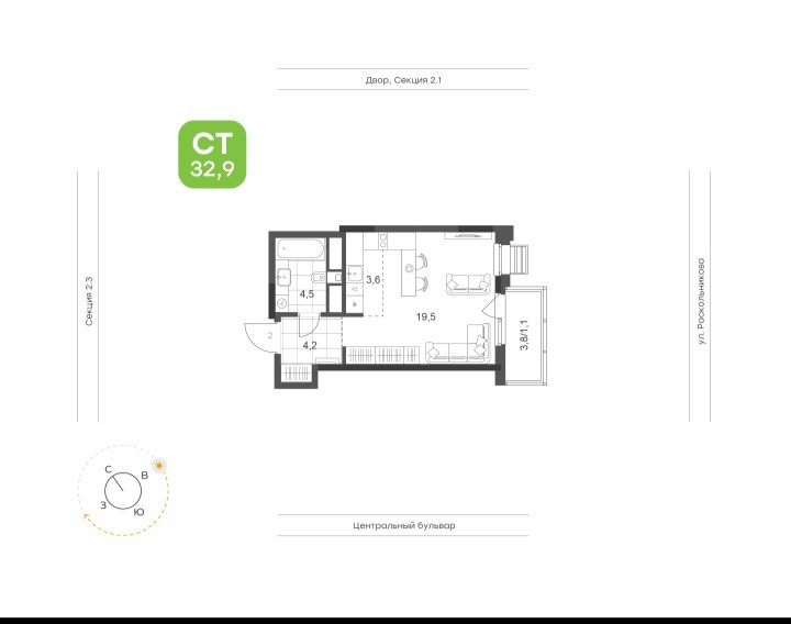 Общая площадь 32.9 м2