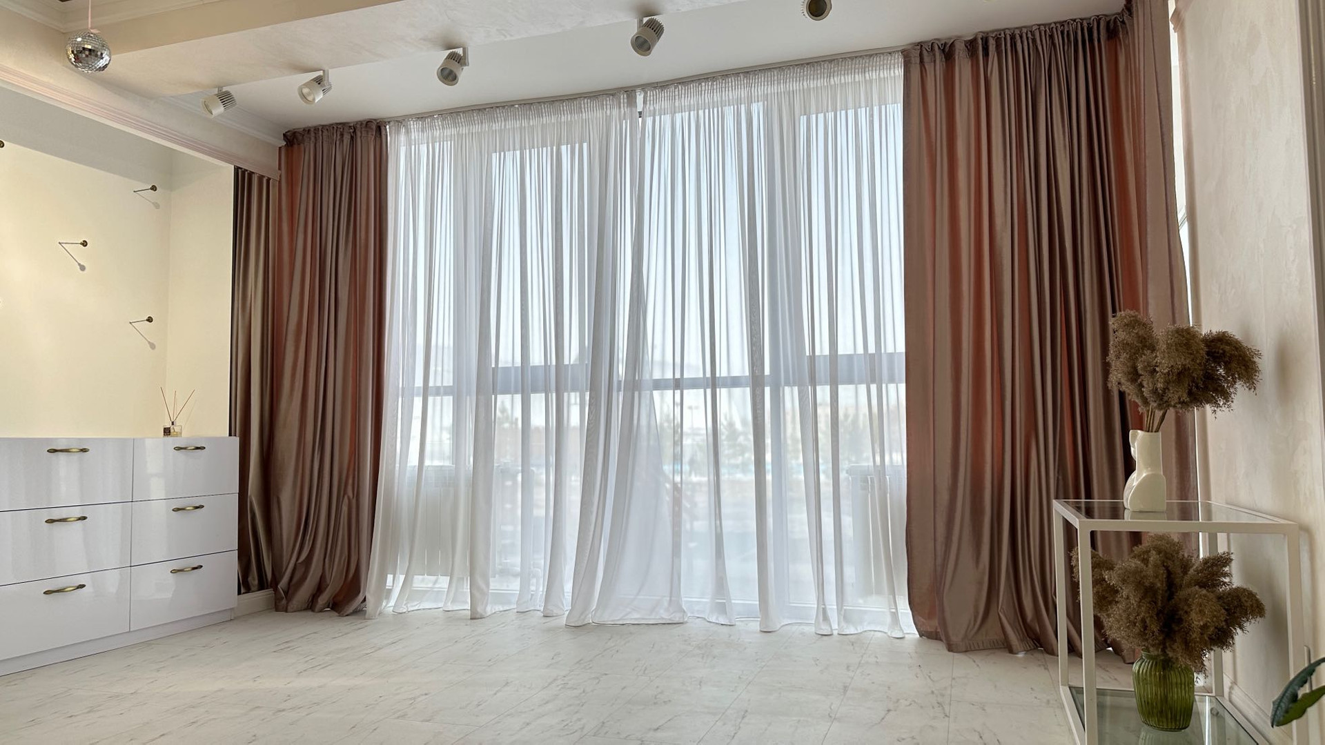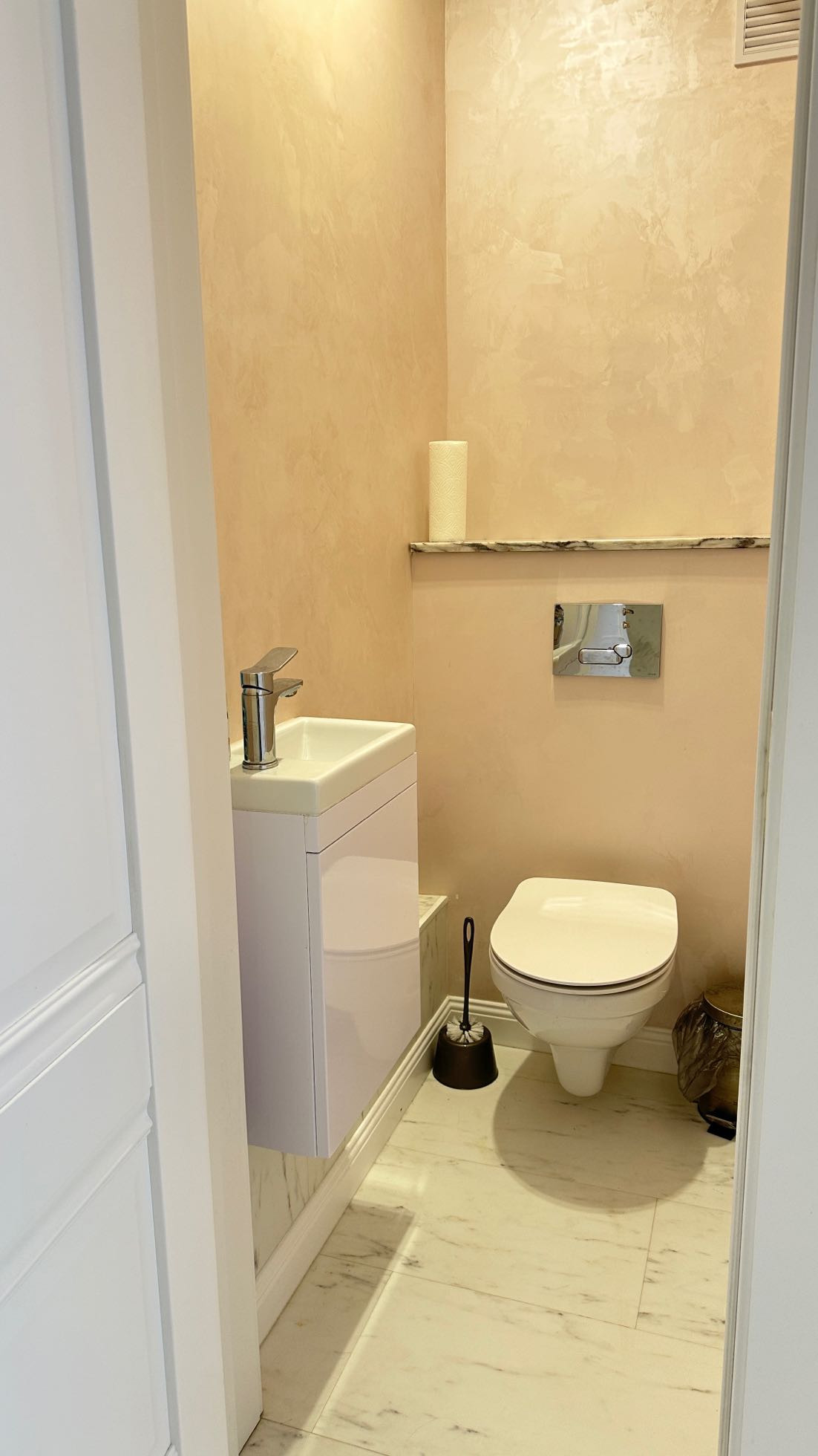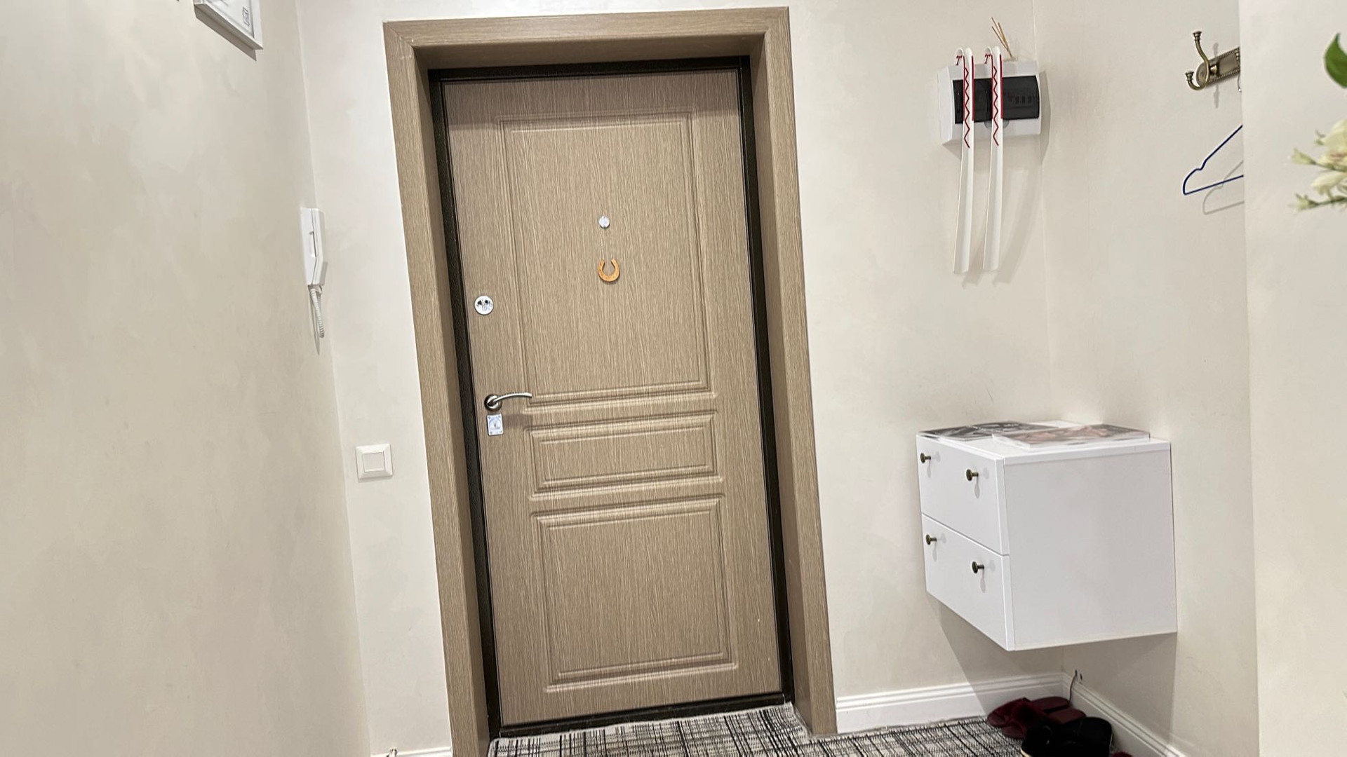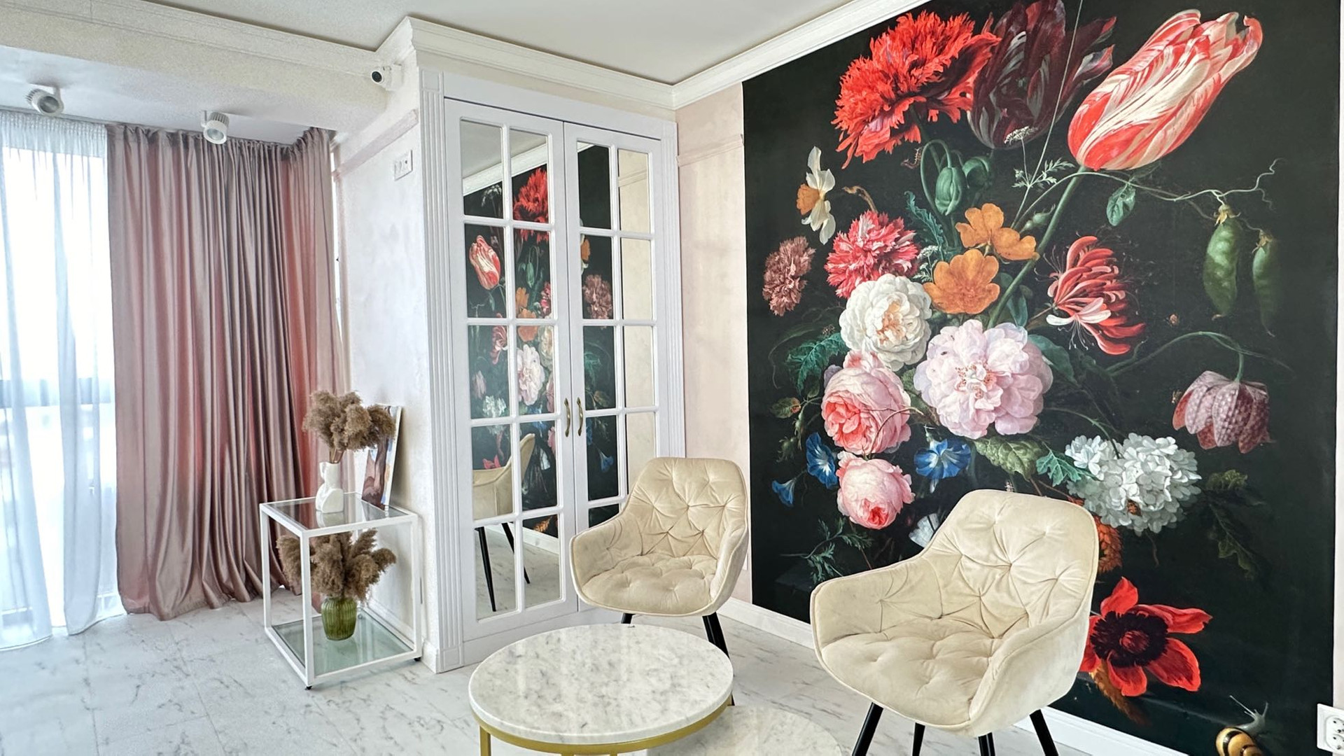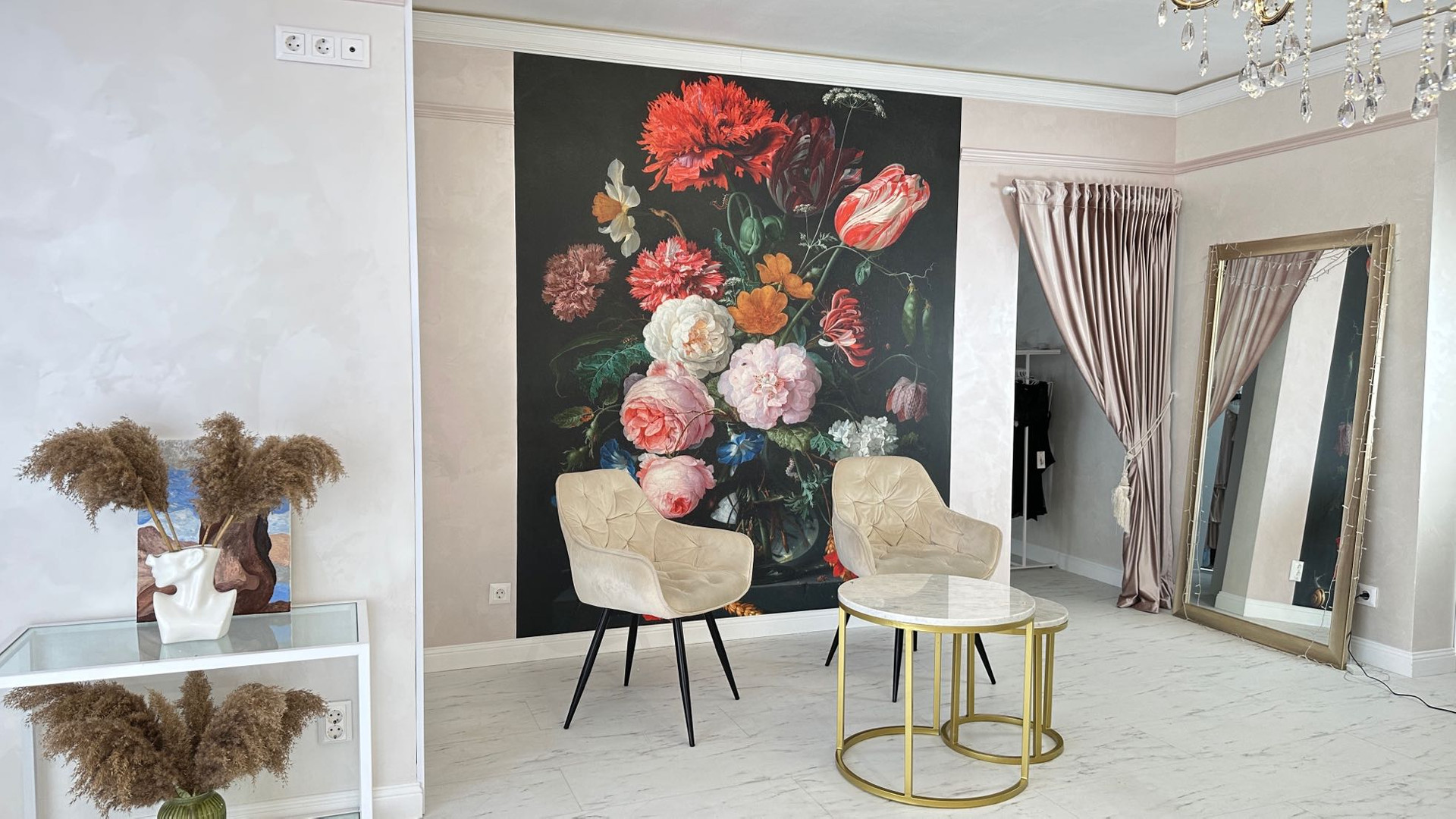 Евроремонт дизайнерский. Потолок выровнен, на стенах декоративная штукатурка, дорогая фреска, на полу белый кварцвинил.