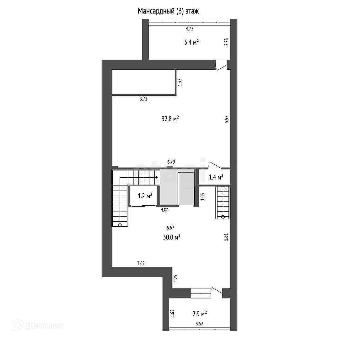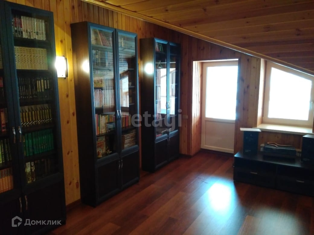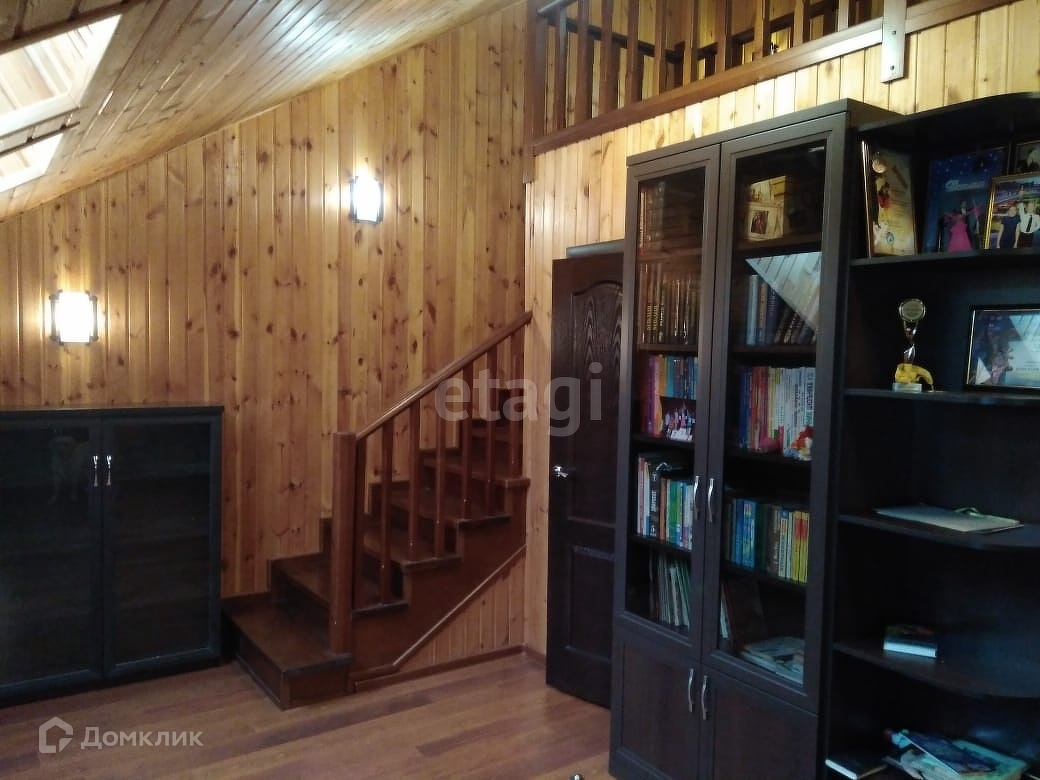 Мансарда представляет собой зал-библиотеку обшитый деревом, с балконами, зоной для рабочего места на подиуме-антресоли, красиво оформленным лестницами и перилами, выше этажом еще один зал, используемый ранее в качестве игровой, так же благодаря мансардным окнам подойдет для еще одной спальни.