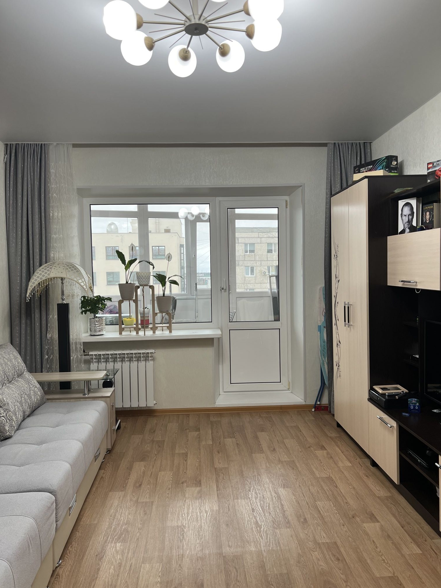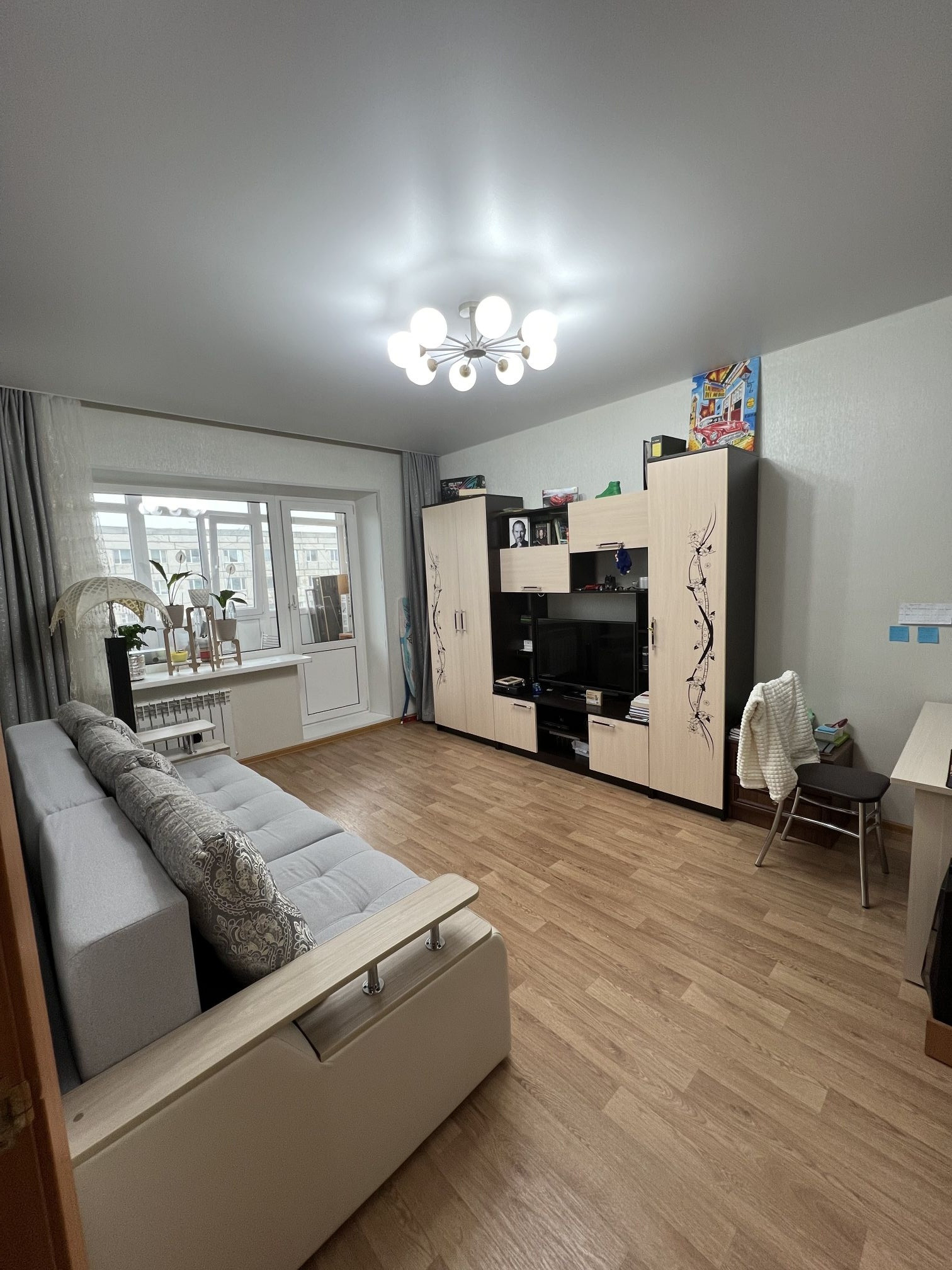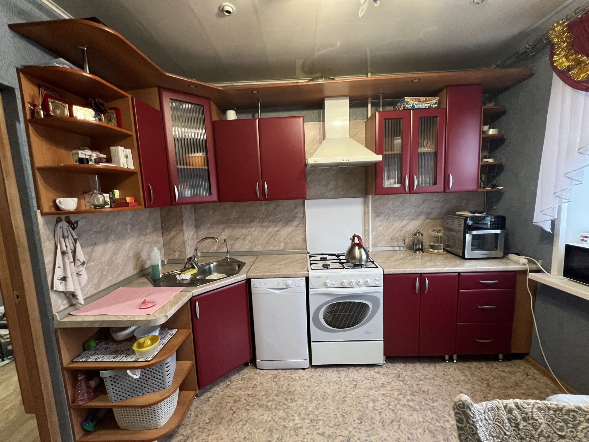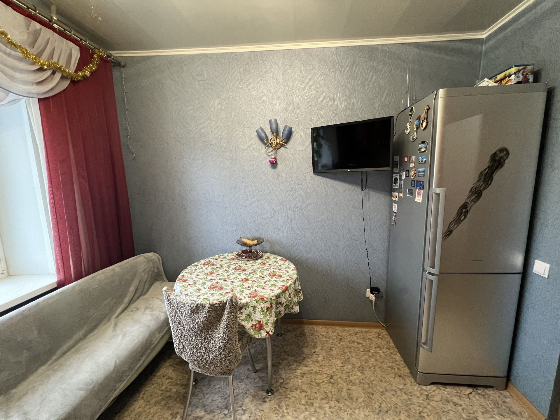 В квартире остаются кухонный гарнитур, газовая плита, холодильник, кухонный стол с табуретками, шкаф в прихожей, обувница, вешалка, угловой диван, шкаф-купе в зале, телевизор. Всё в исправном состоянии. ТОРГ уместен.