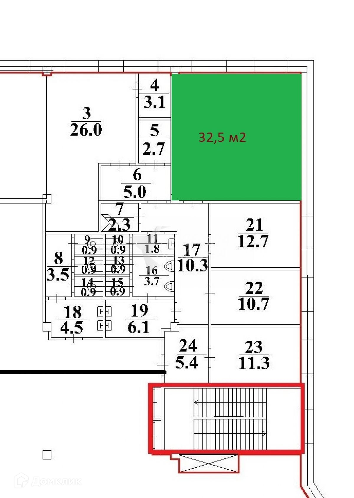 Площадь кабинета 32,5 м2. (на плане выделено цветом).