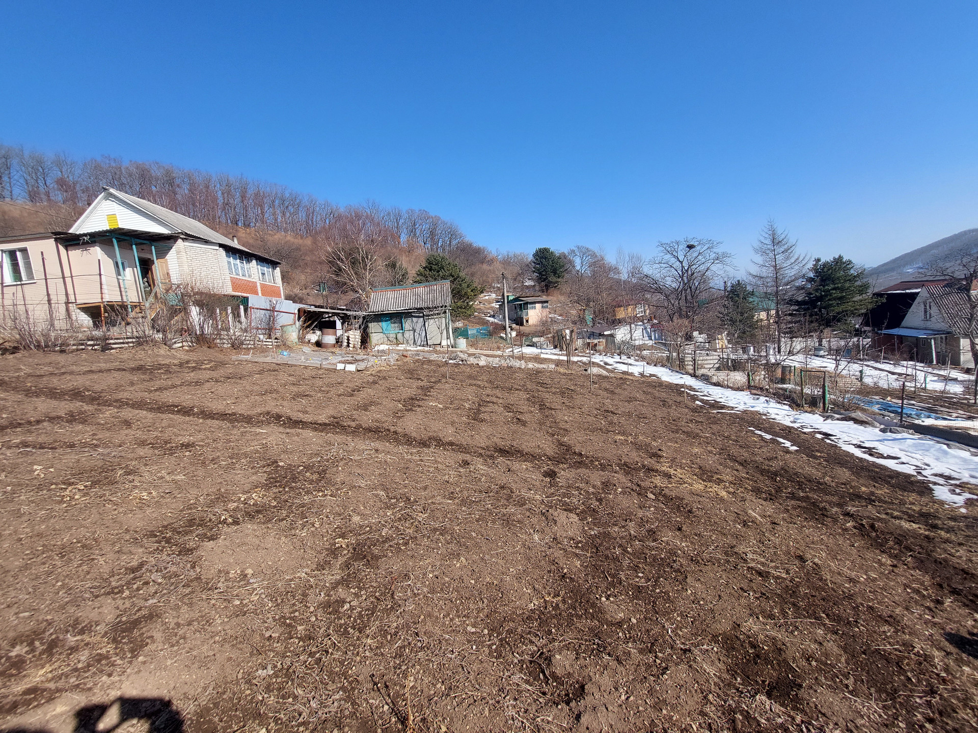 Разработанный участок 7 соток в собственности, под небольшим наклоном, красивый вид на распадок.