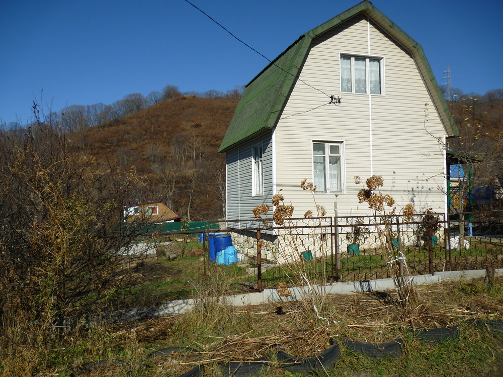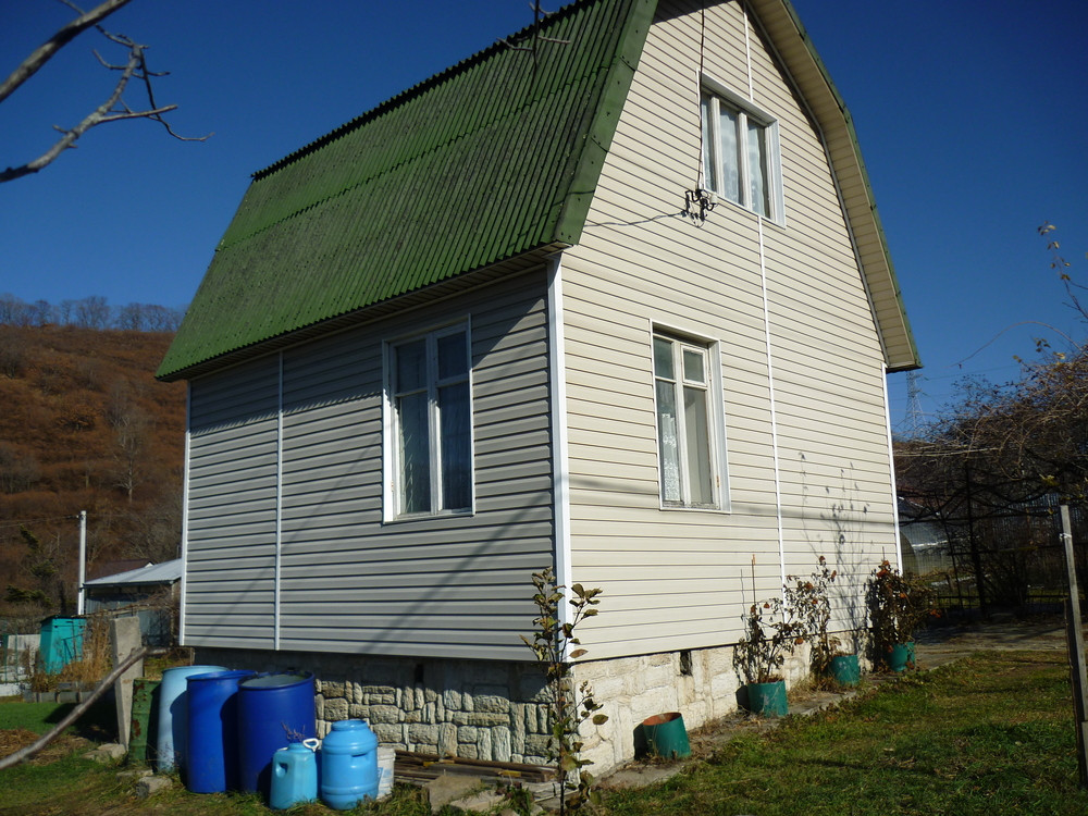 Уютный 2-х этажный домик с верандой (брус, доска) в СНТ «Зеленый сад», ул. Ключевая (р-он пляжа "Золотари"). Дом - 40,4 м2, для летнего отдыха, в т.ч. весной и осенью. Обшит сайдингом, цоколь - облицовочный камень, кровля - ондулин. Имеется подвал с отдельным входом. Фундамент ленточный. Электричество - 6 кВт.