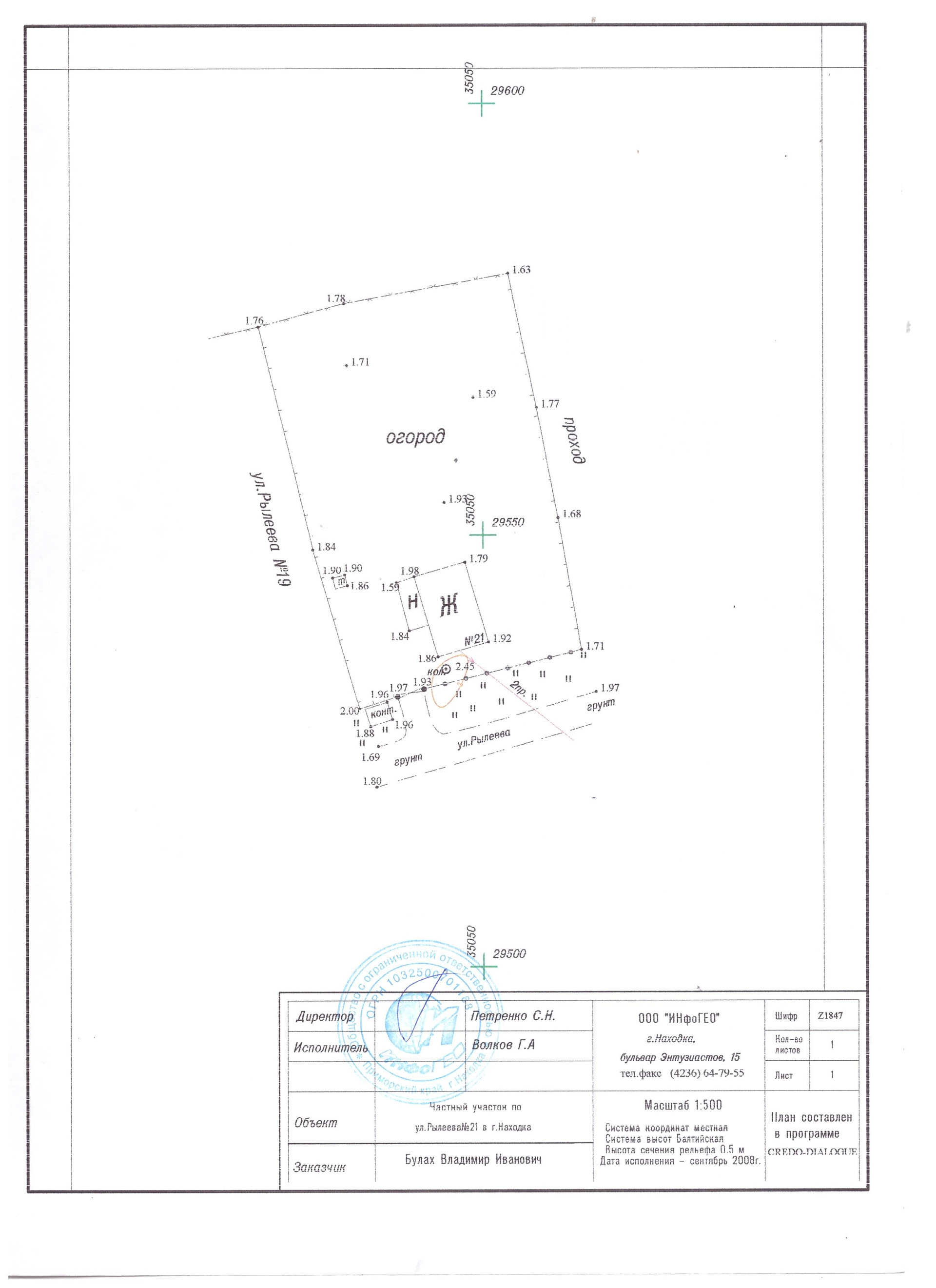 Земельный участок площадью 1262м2 в собственности. Огорожено забором из металлопрофиля.
