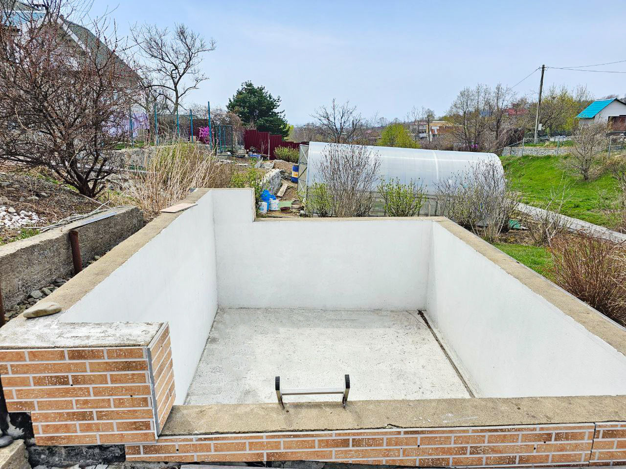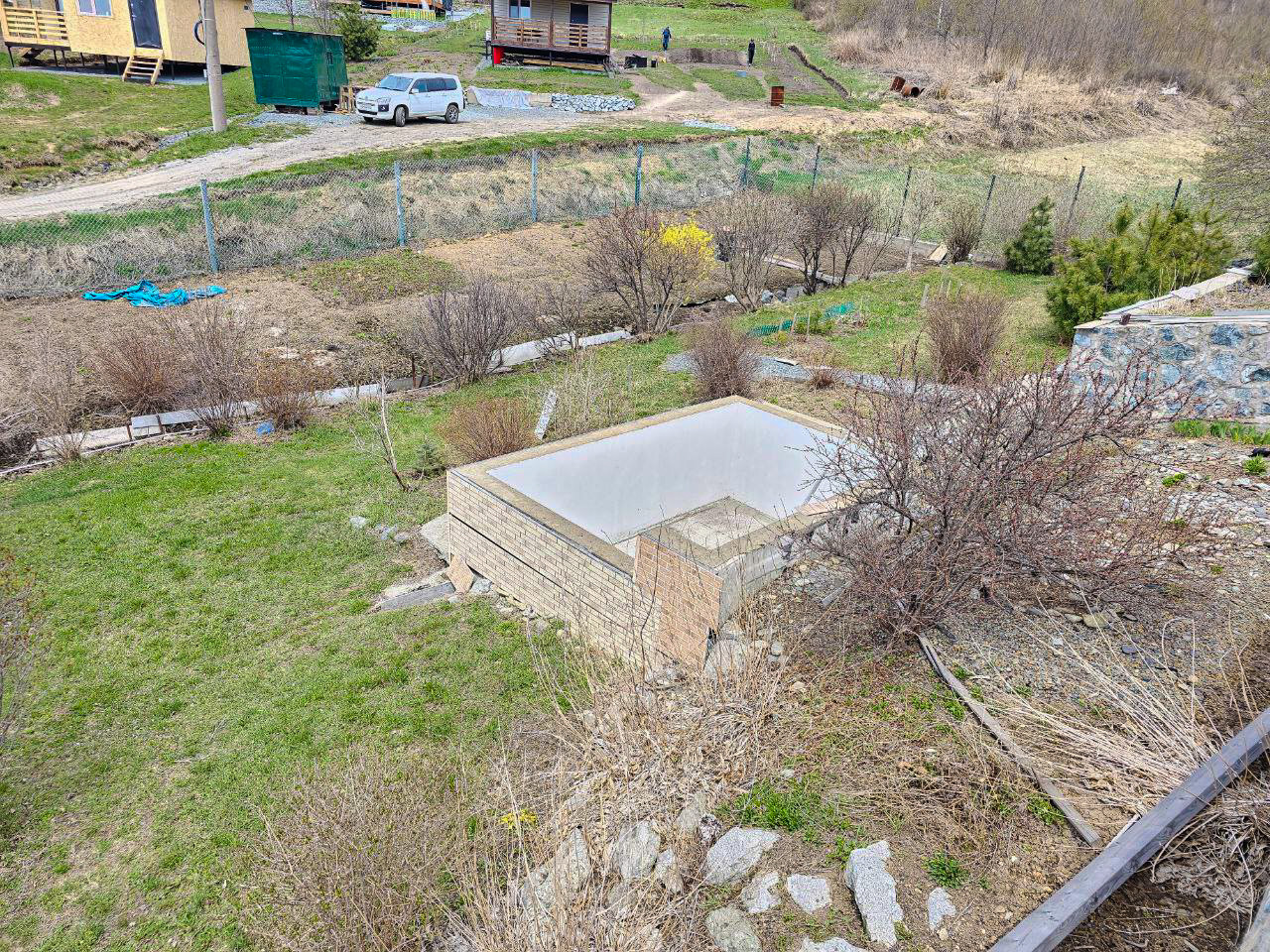 Участок ухоженный, двухуровневый. На верхнем уровне дом и парковка на нижнем приусадебный участок с бассейном. Уровни разграничены подпорной стеной сложённой из гранитных камней.
