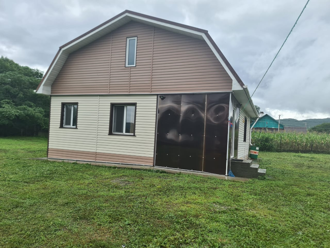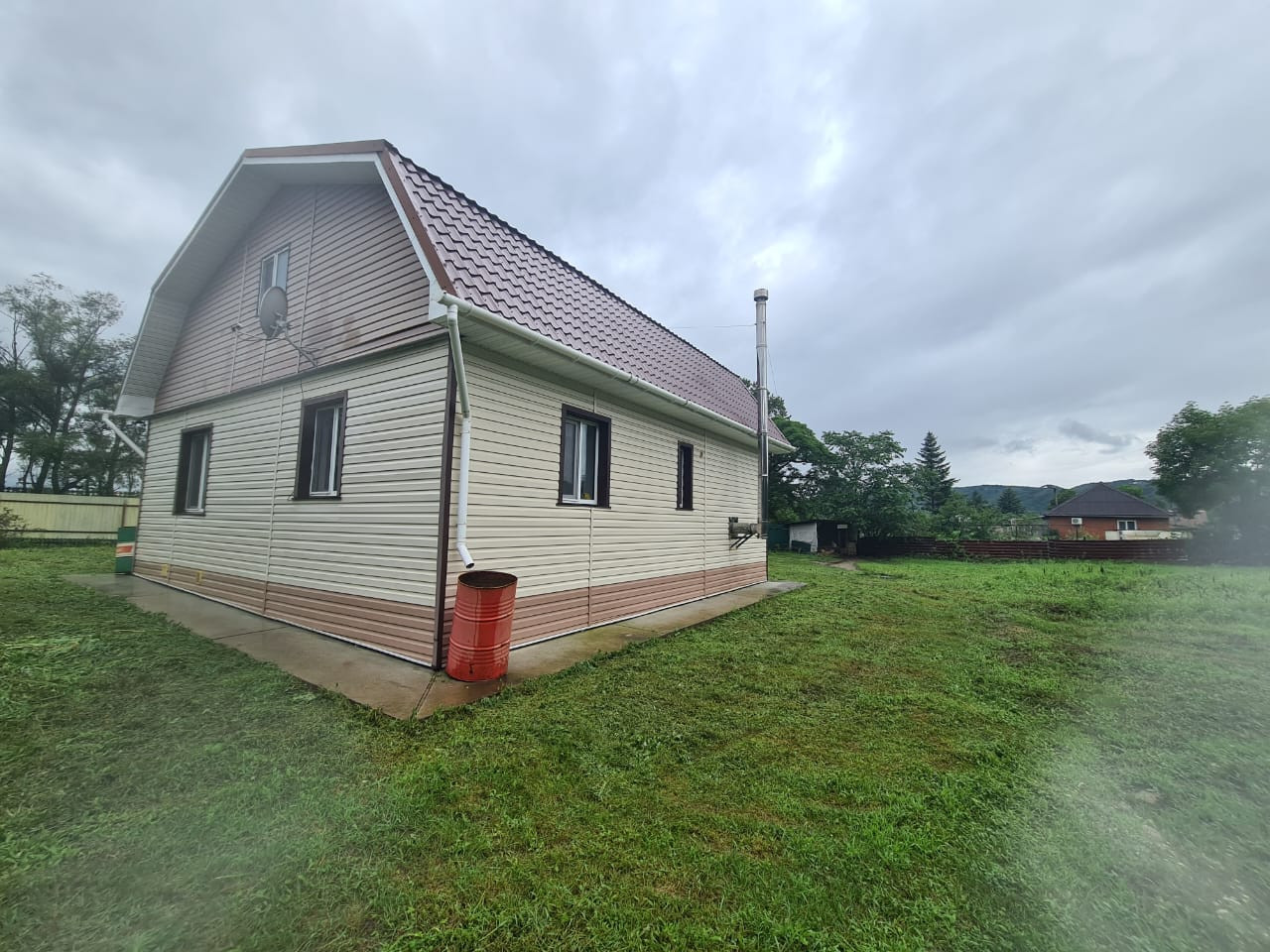 Сам дом утеплён и обшит сайдингом, кровля - металлочерепица.