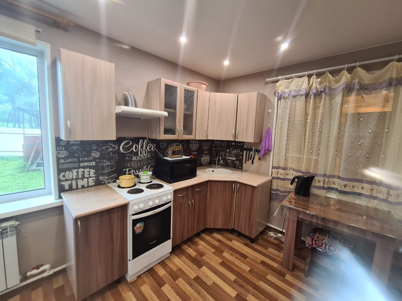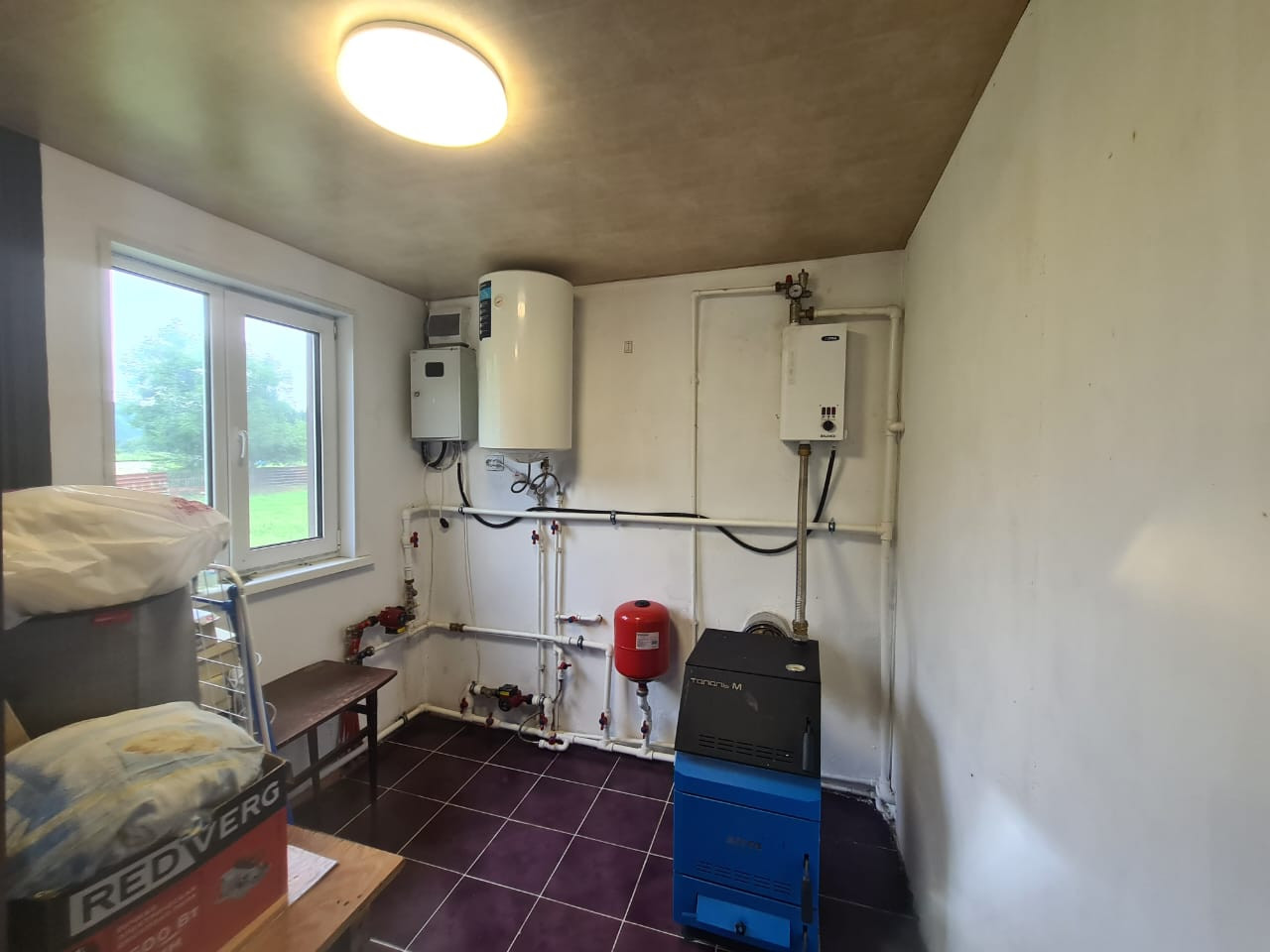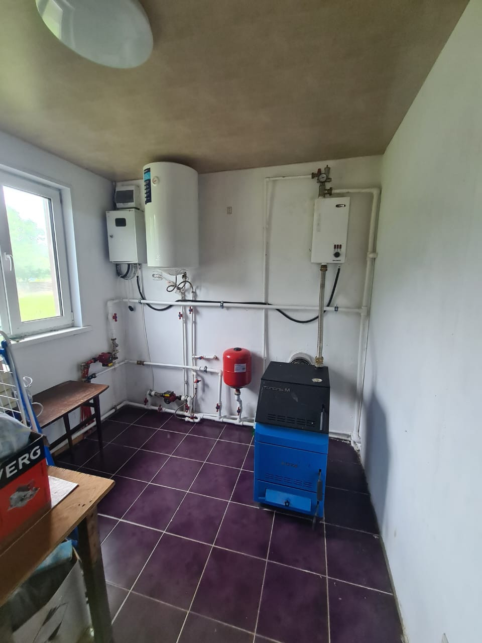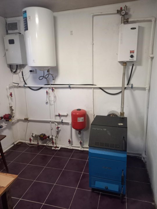 Отопление - твёрдотопливный котёл, радиаторы, система "тёплый пол", эл. тены.