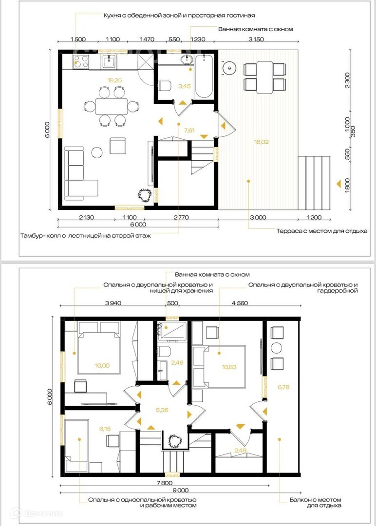 1 этаж: терраса, прихожая с пространством для хранения под лестницей, совмещенный санузел, просторная и светлая кухня – гостиная.