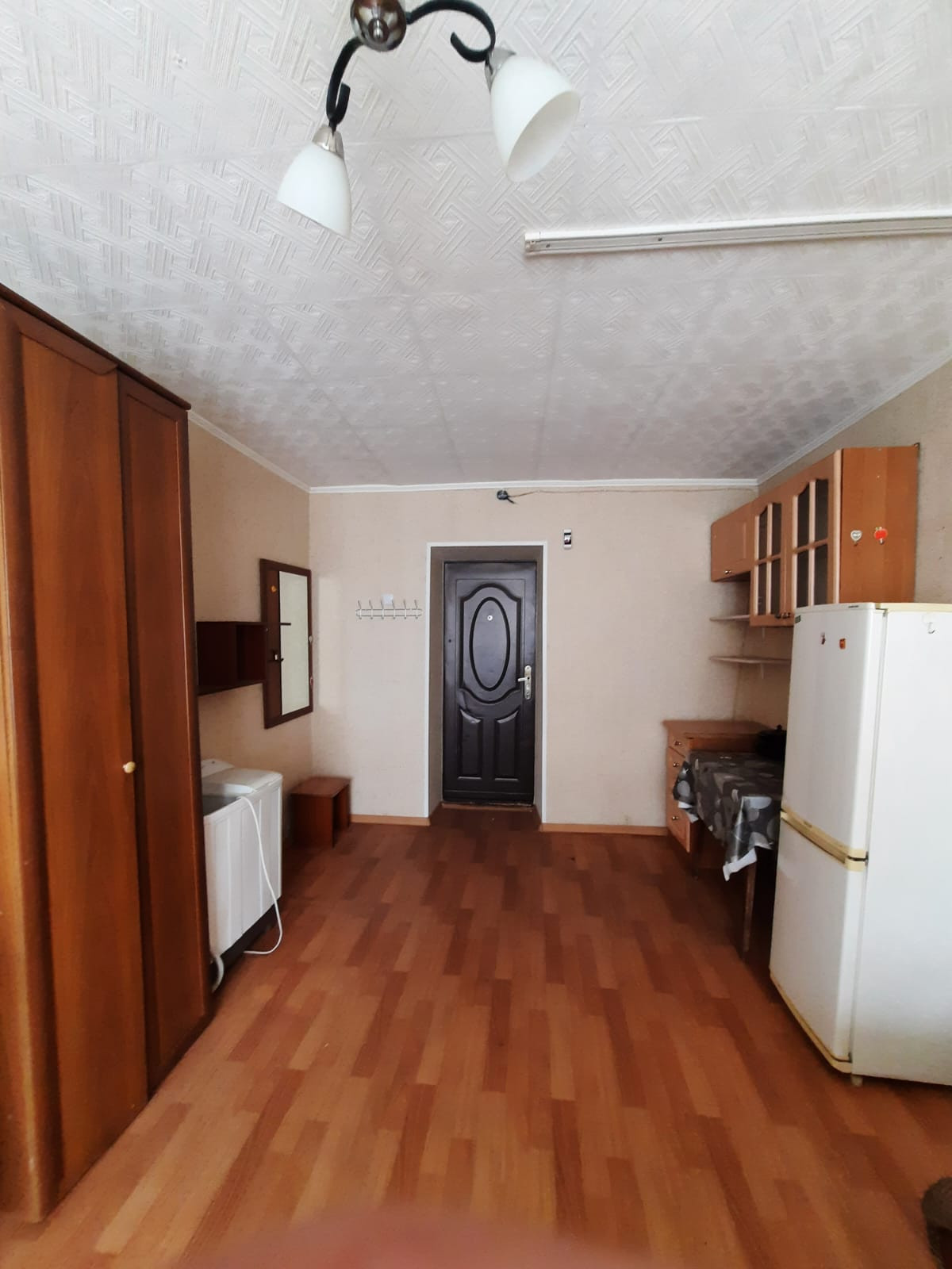 Металлическая дверь, установлен новый радиатор отопления, пластиковое окно, линолеум, обои.