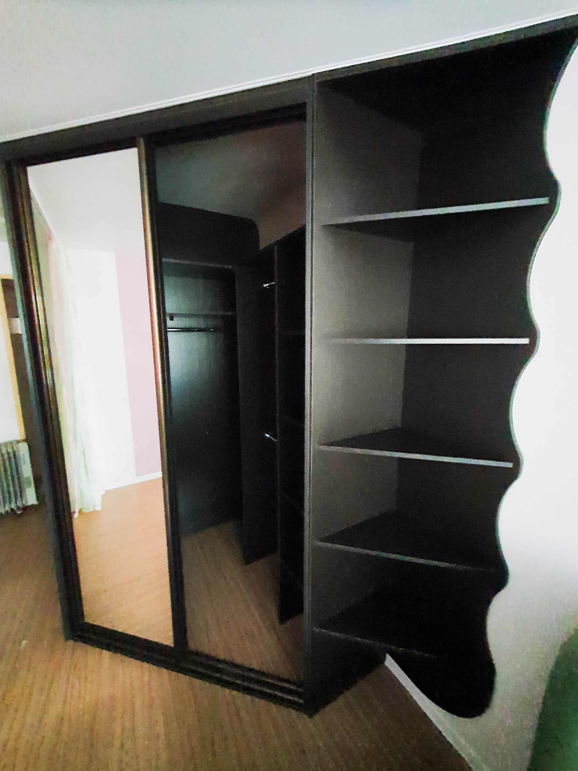 Большой, вместительный, встроенный шкаф-купе удачно зонирует комнату.