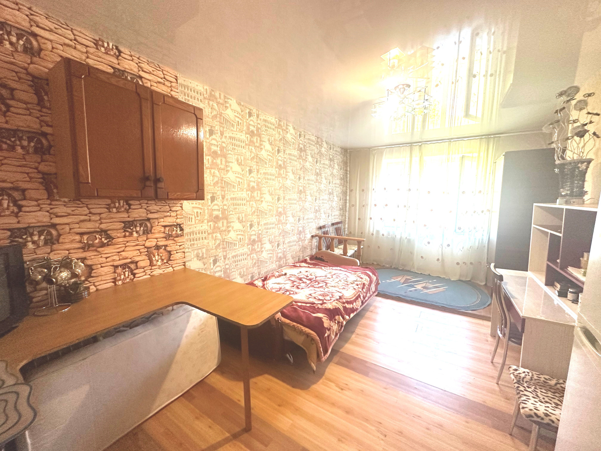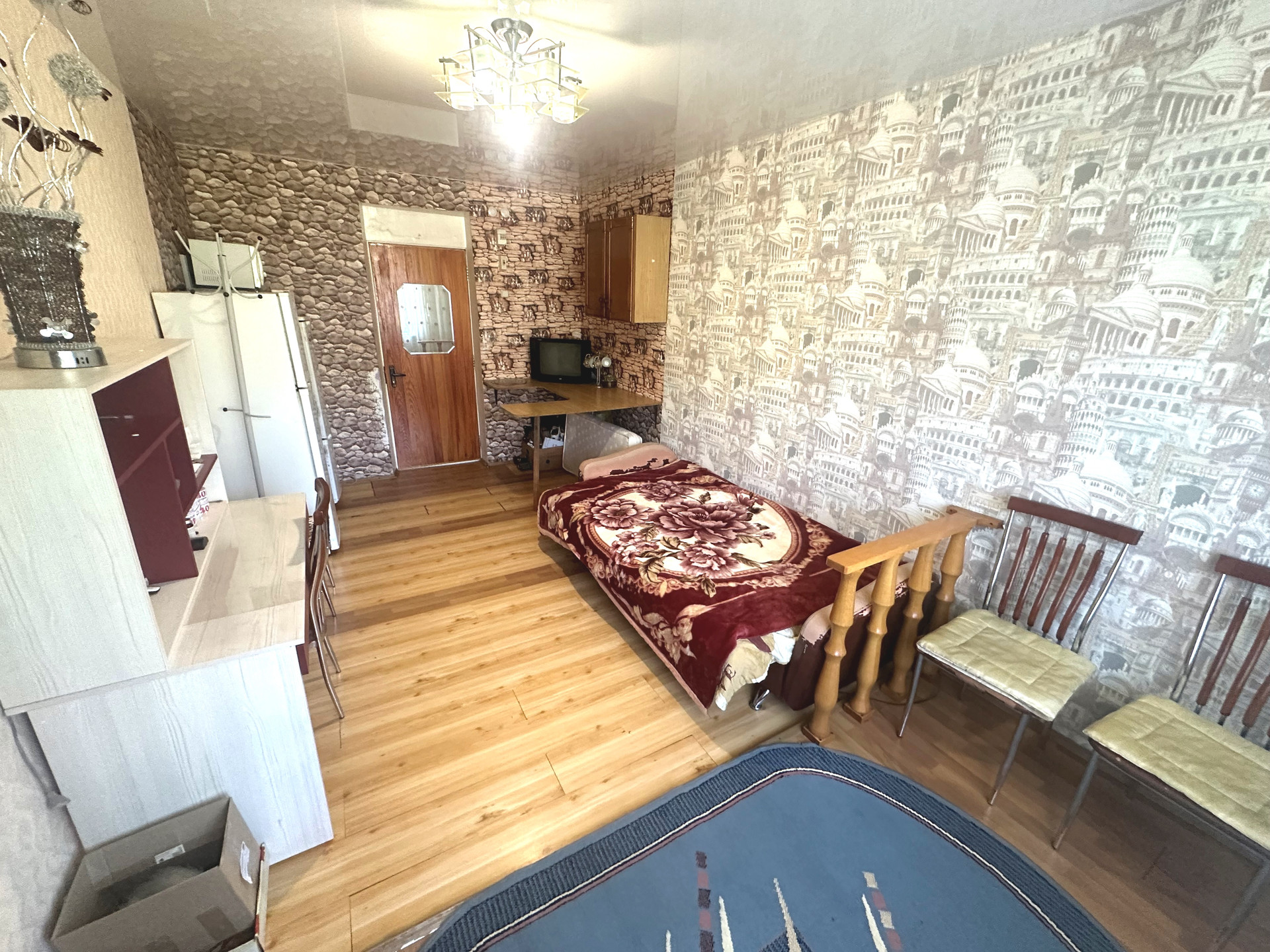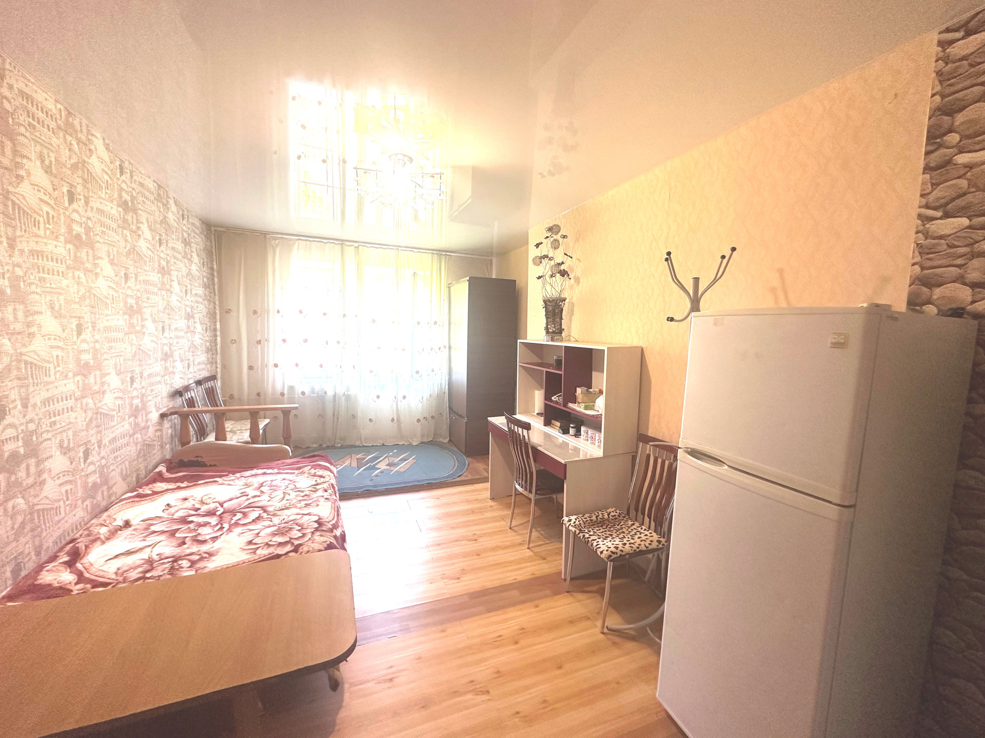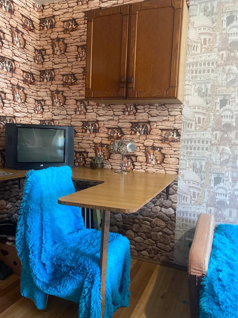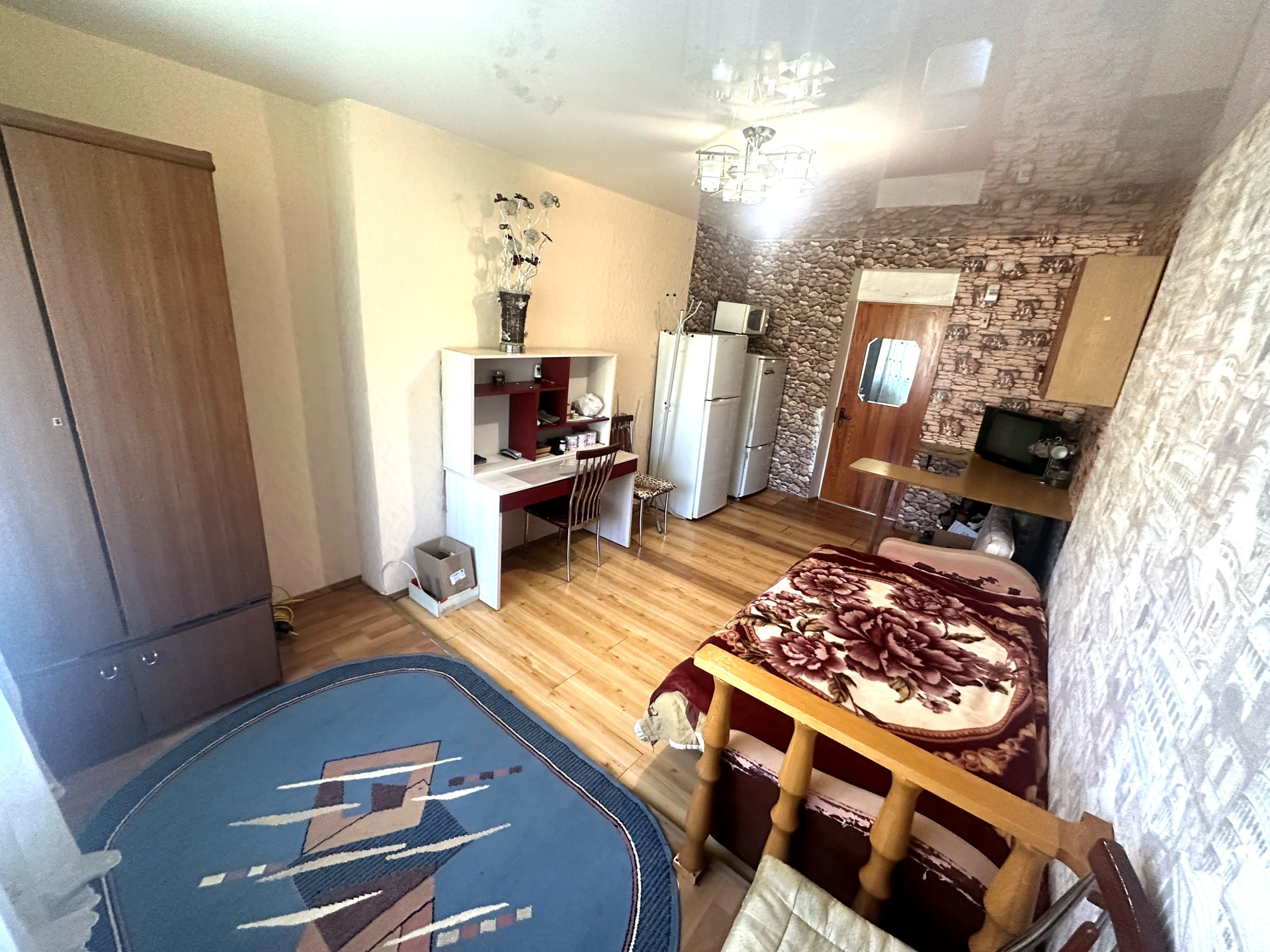 - Все для проживания (кухонная зона, рабочий уголок, холодильник, стиральная машина, микроволновая печь, телевизор, диван);